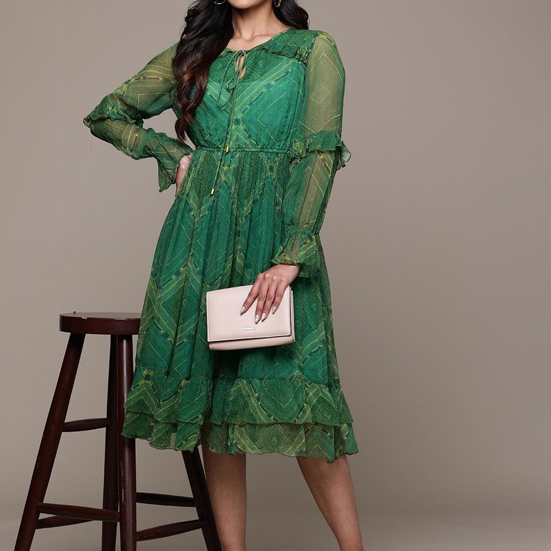aarke Ritu Kumar Print Tie-Up Neck Puff Sleeve Ruffled Chiffon Fit & Flare Dress