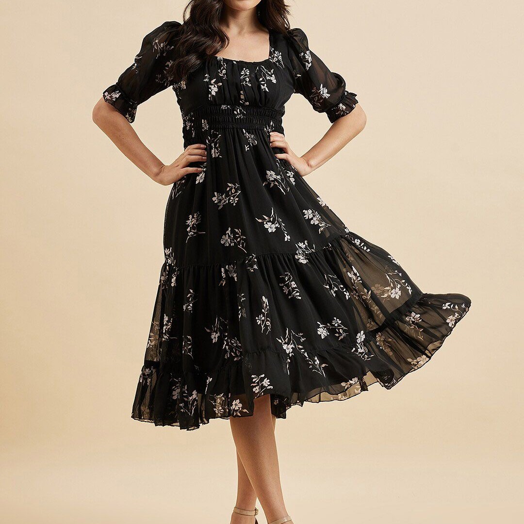 Azira Floral Print Square Neck Puff Sleeve Georgette Fit & Flare Midi Tiered Dress