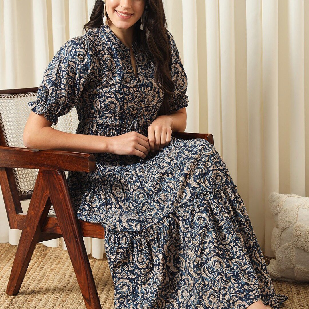 KALINI Floral Printed Mandarin Collar Puff Sleeves Cotton Fit and Flare Dress