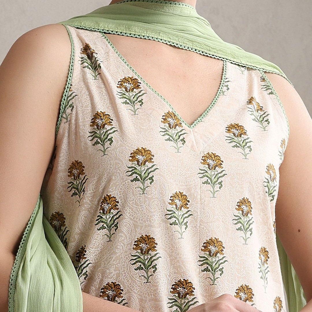 Khushal K Floral Printed V-Neck Pure Cotton Kurta With Palazzos And Dupatta