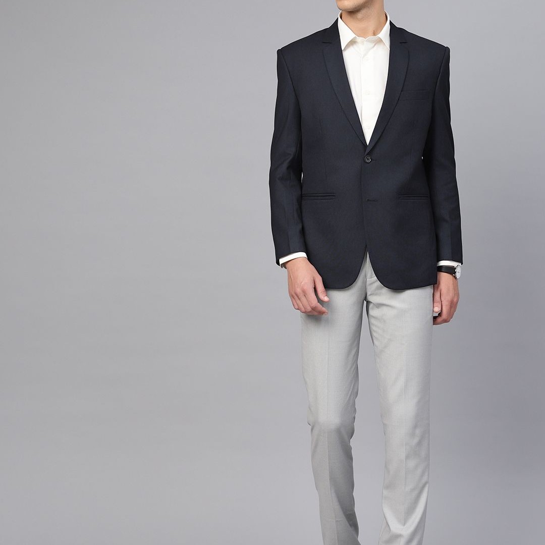 MANQ Men Navy Blue Slim Fit Solid Single Breasted Formal Blazer