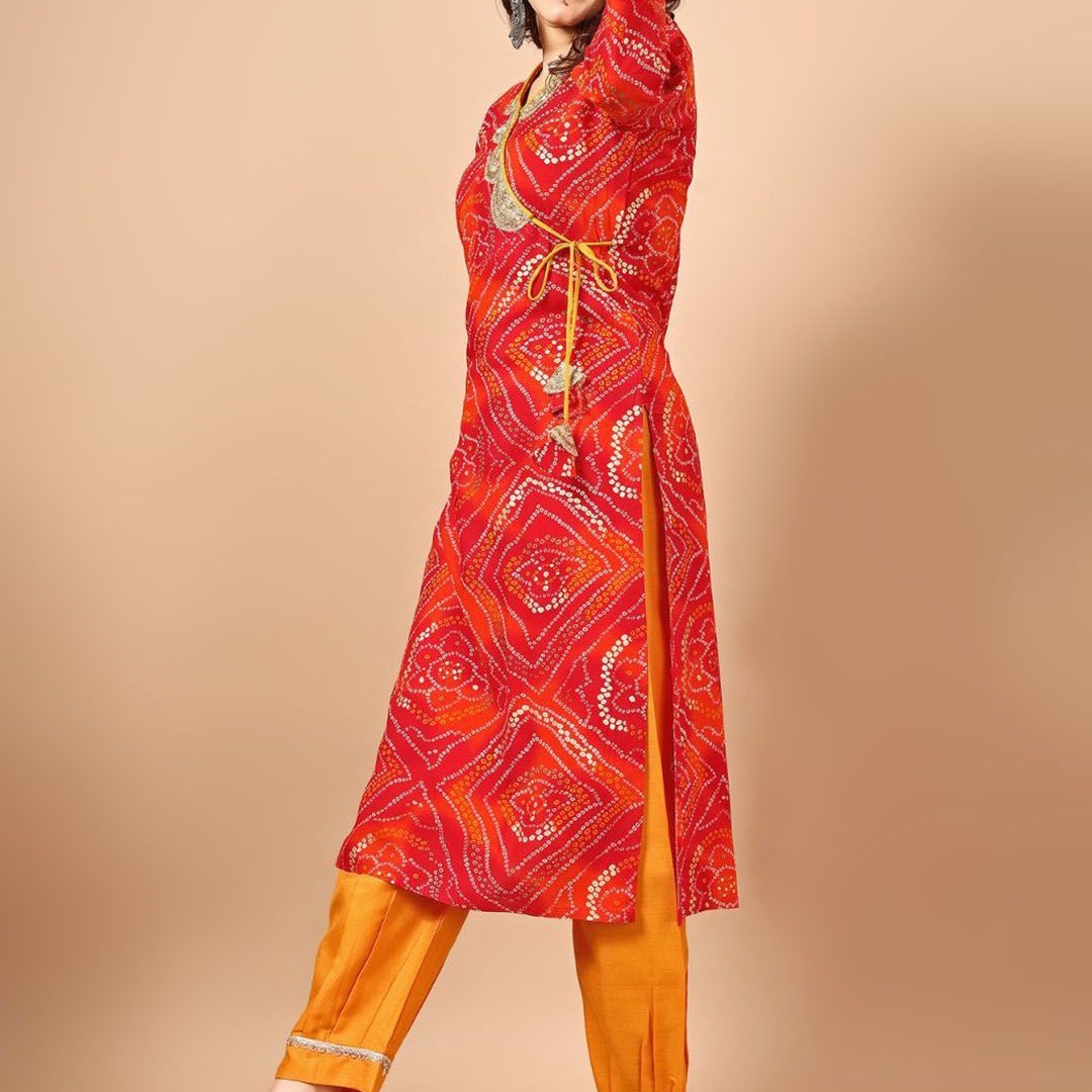 Sangria Red Bandhani Printed Angrakha Sequined Straight Kurta