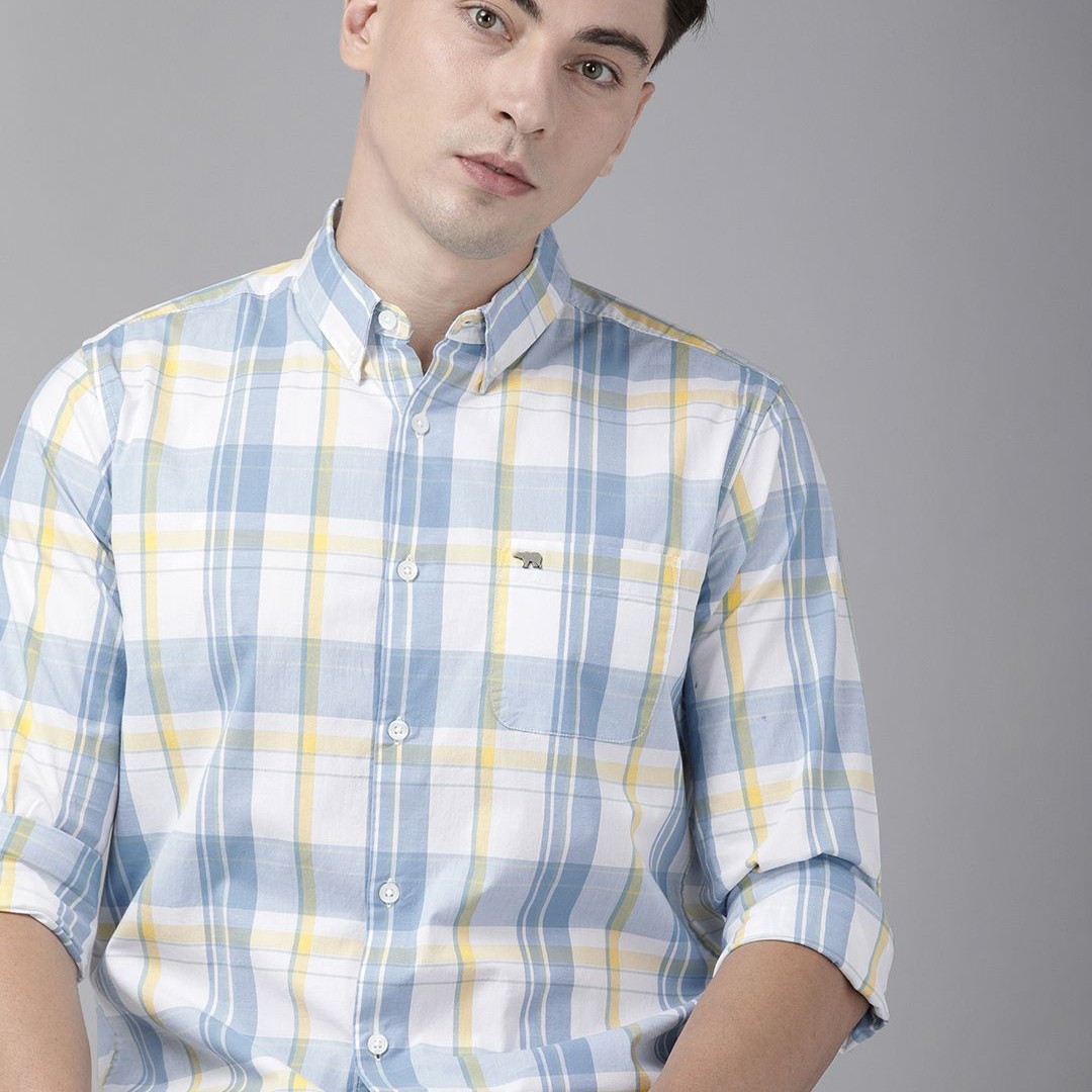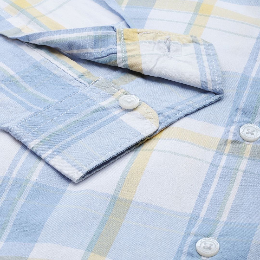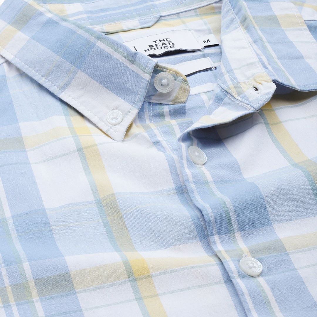 THE BEAR HOUSE Men White & Blue Classic Slim Fit Checked Pure Cotton Casual Shirt