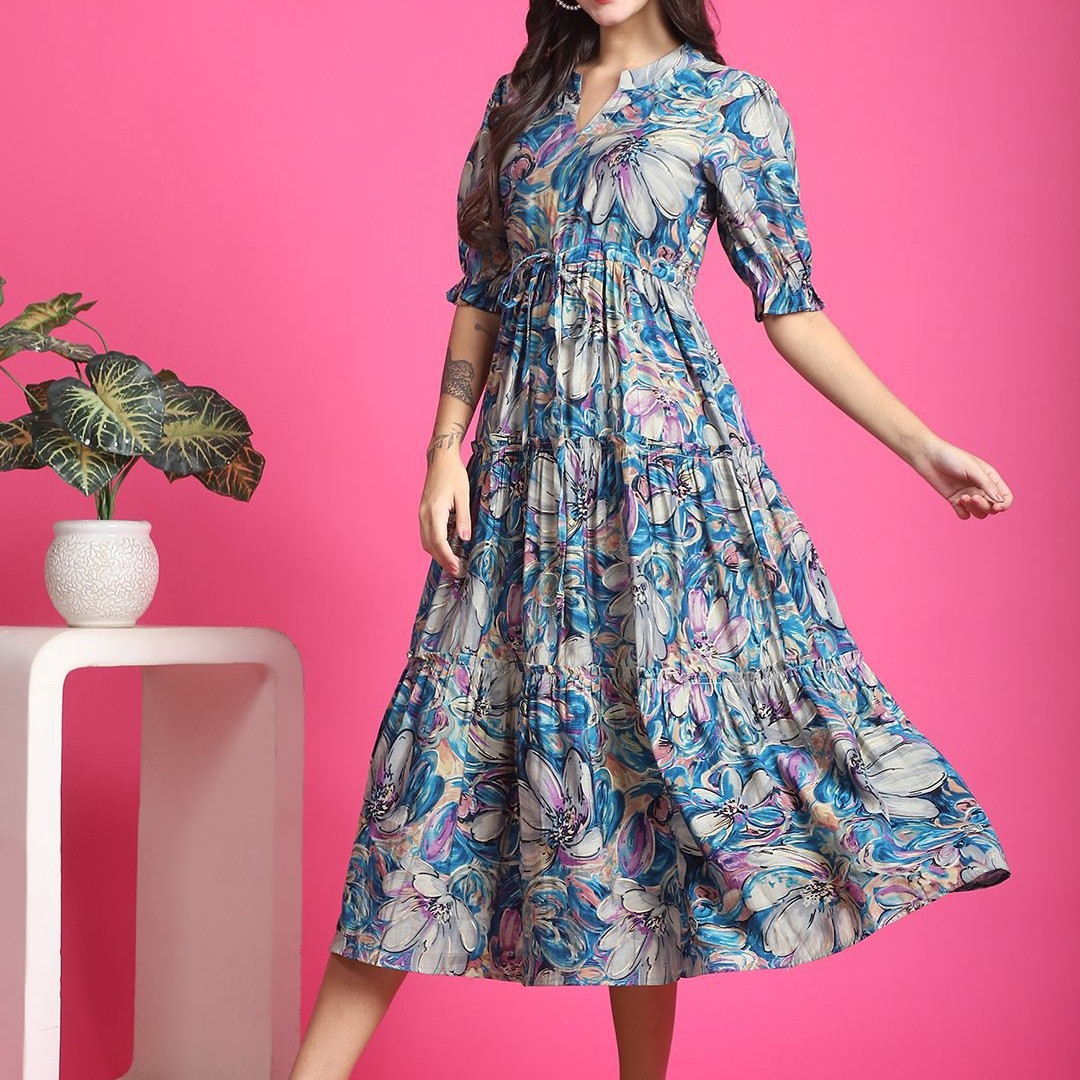 Claura Women Floral Print Mandarin Collar Short Sleeves Fit and Flare Midi Dress
