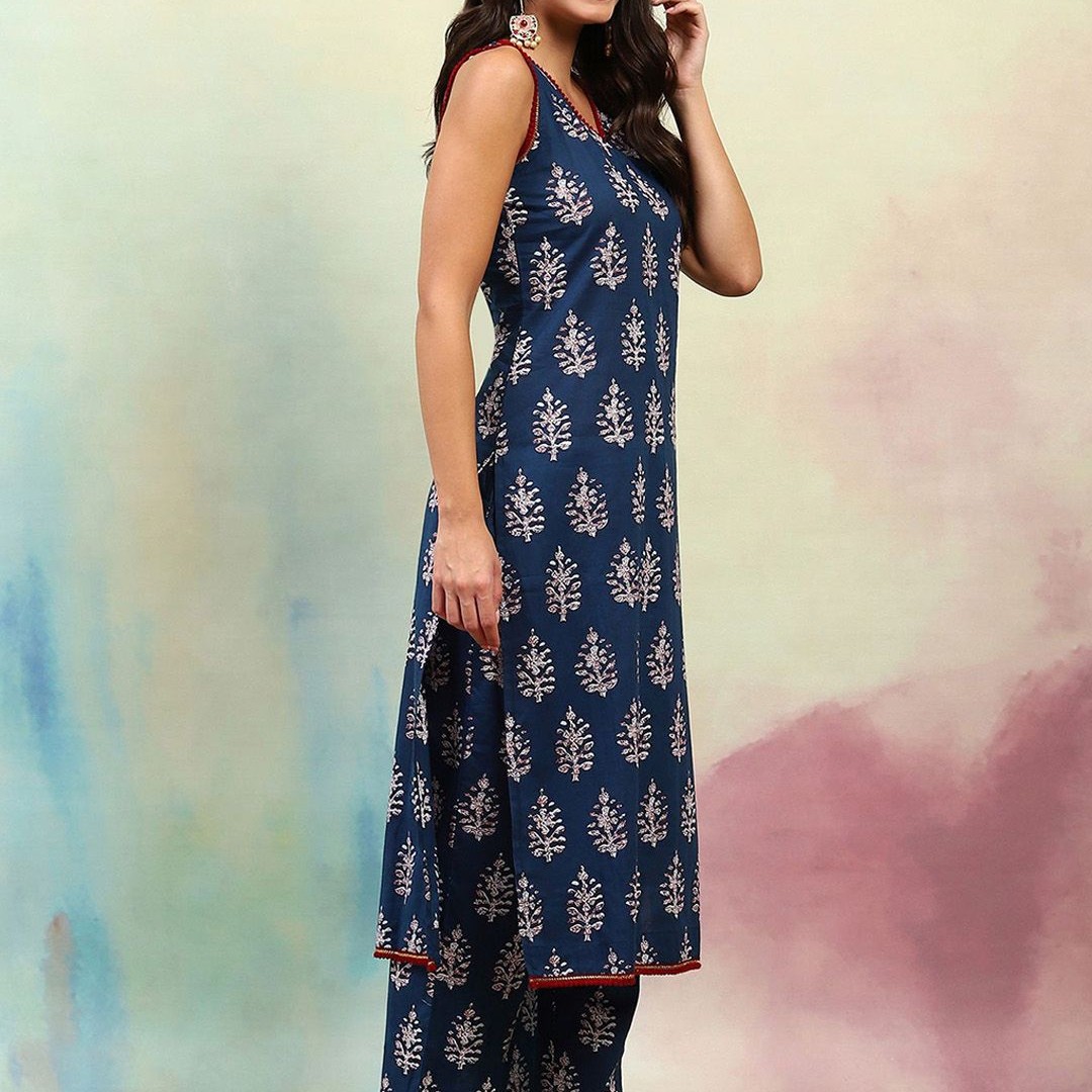 Khushal K Ethnic Motifs Printed V-Neck Sleeveless Pure Cotton Kurta with Palazzo & Dupatta