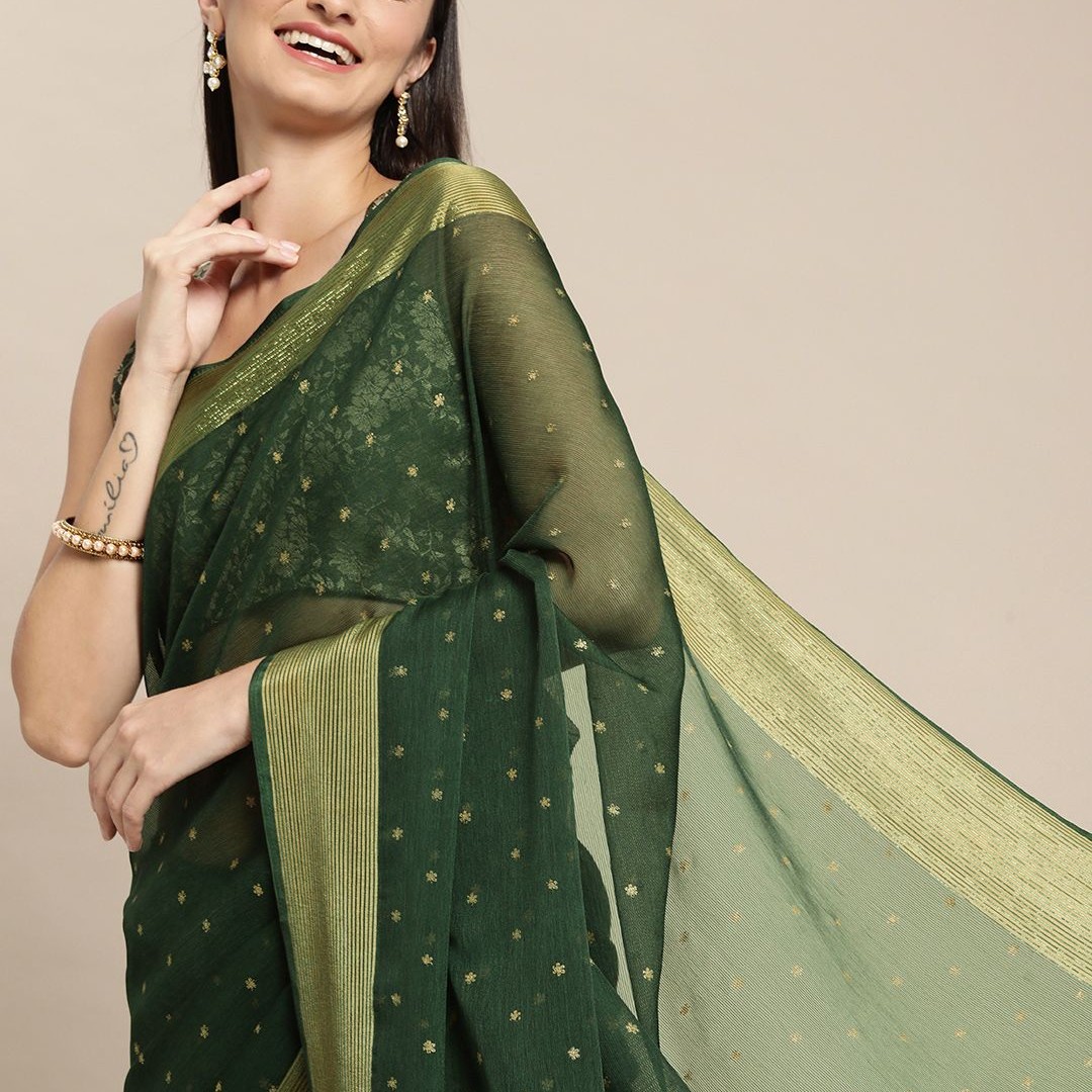 Mitera Green & Gold-Toned Floral Zari Pure Chiffon Saree
