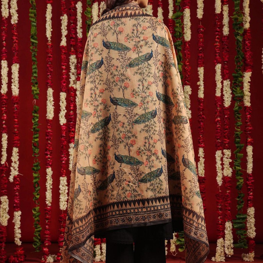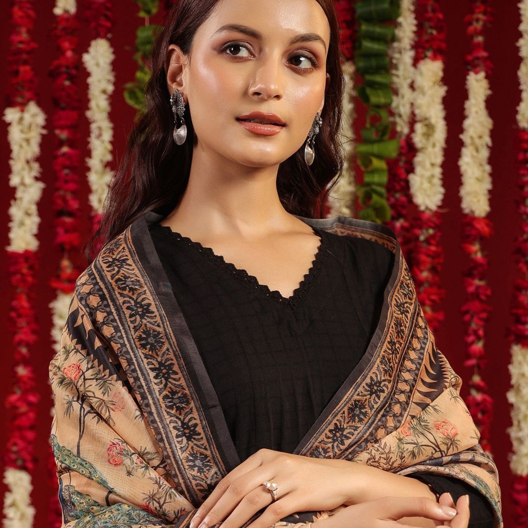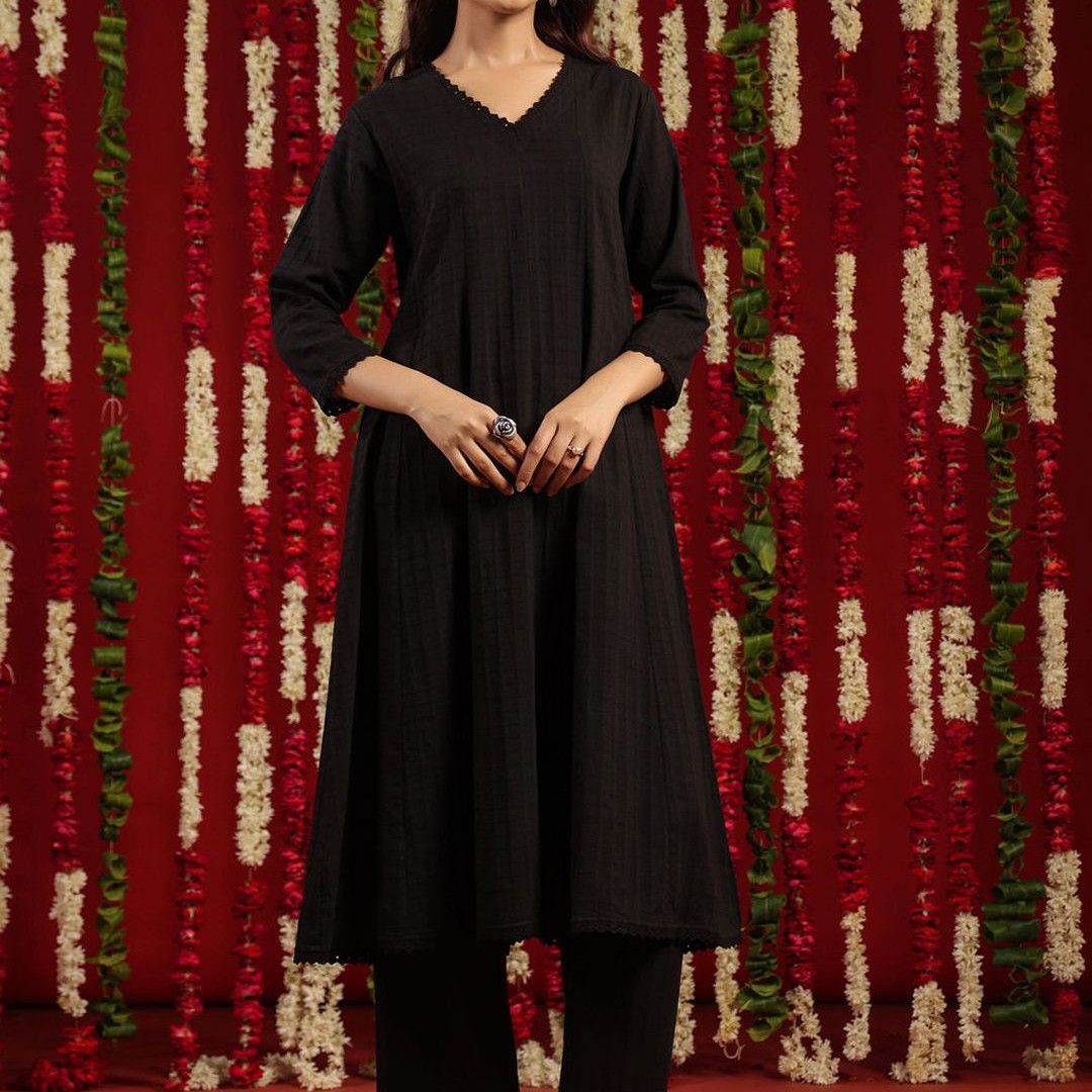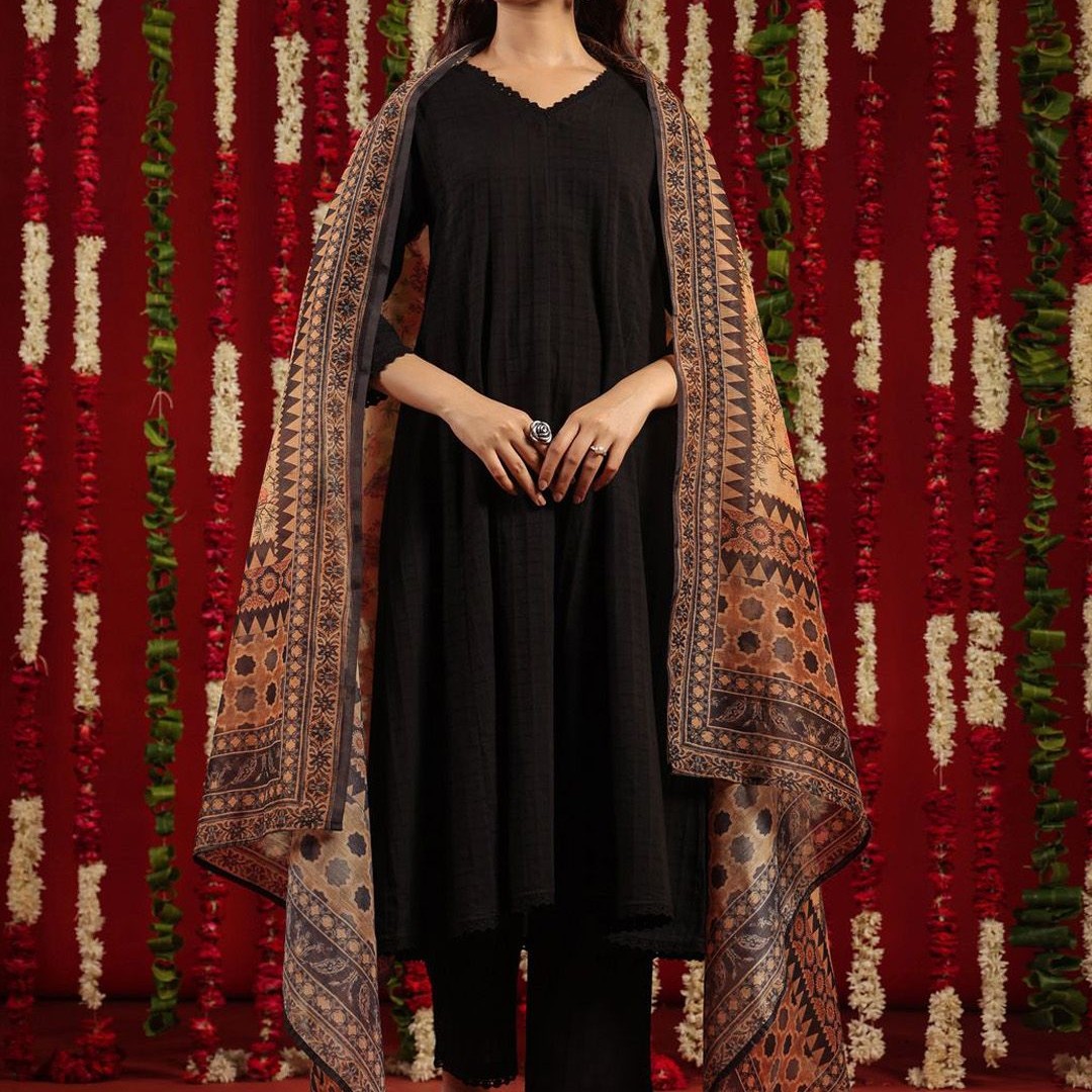 anayna Black & Orange Geometric Woven Design Cotton Anarkali Kurta with Trousers & Dupatta
