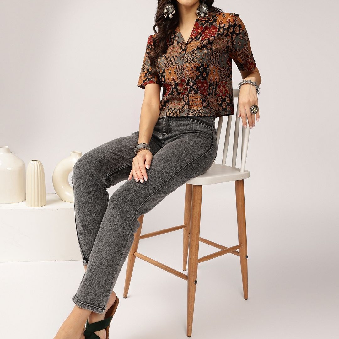 Anouk Ethnic Printed Cuban Collar Pure Cotton Shirt Style Top