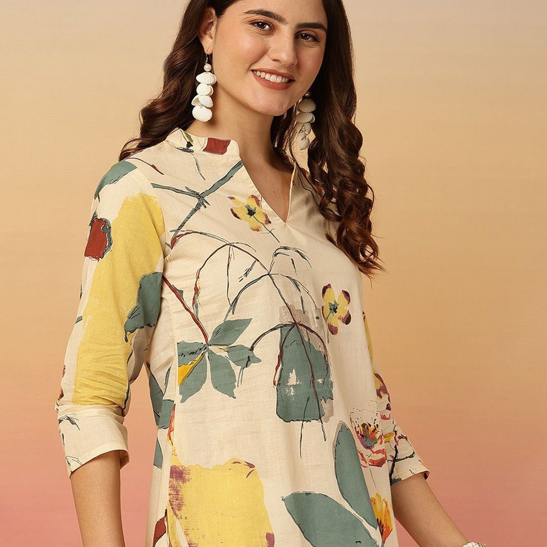 Anouk Rustic Floral Print Mandarin Collar Cotton Top