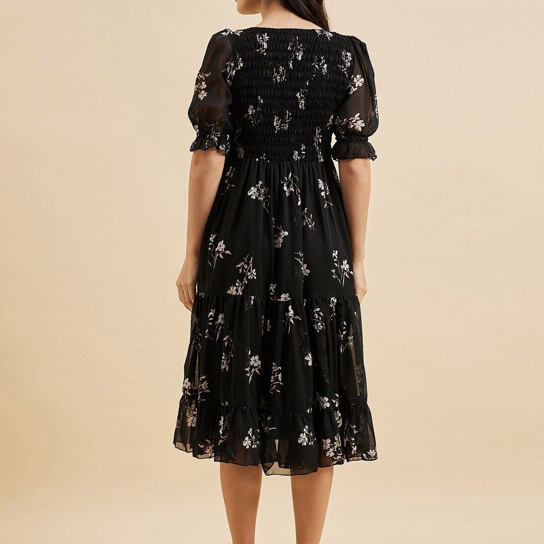 Azira Floral Print Square Neck Puff Sleeve Georgette Fit & Flare Midi Tiered Dress