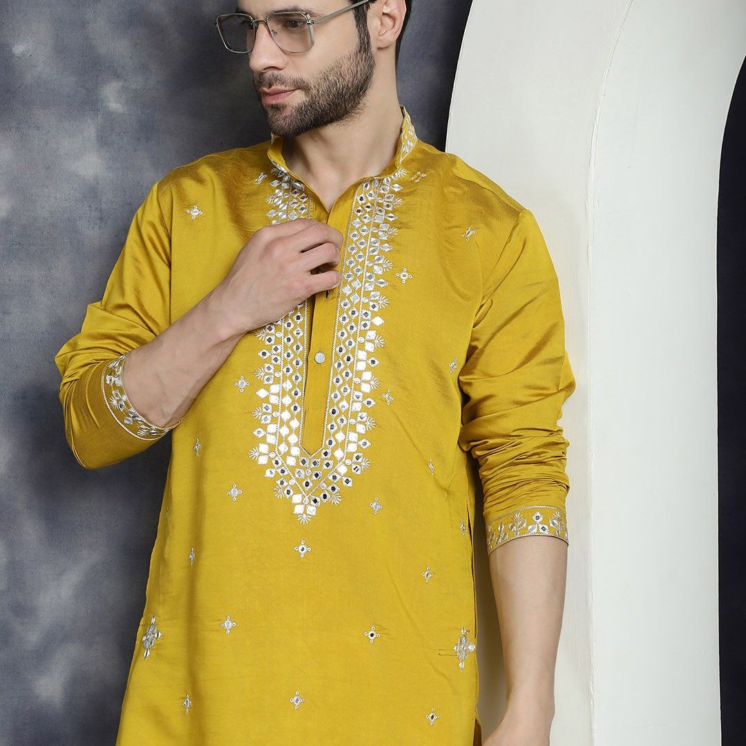 Jompers Geometric Embroidered Mandarin Collar Mirror Work Cotton Silk Straight Kurta