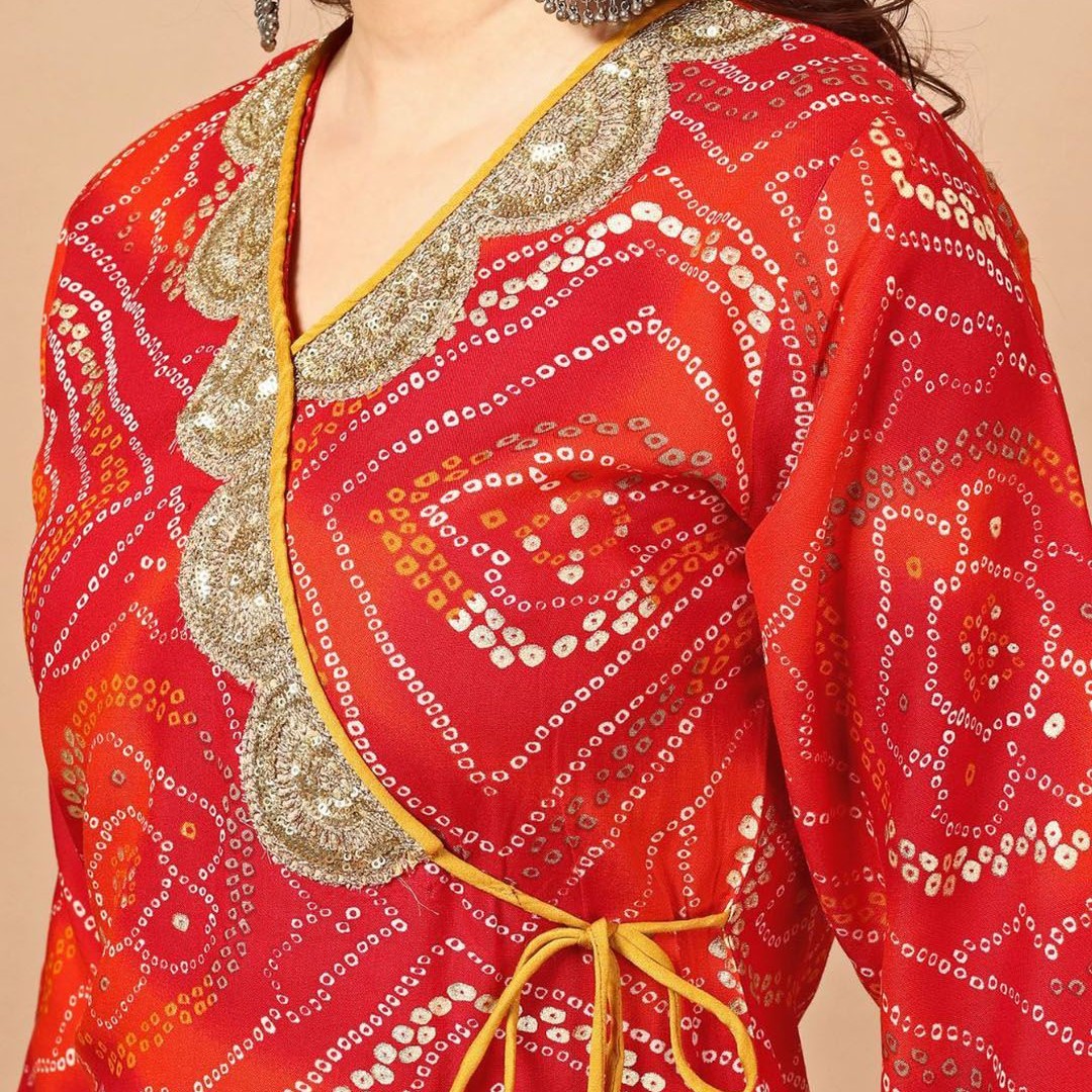 Sangria Red Bandhani Printed Angrakha Sequined Straight Kurta