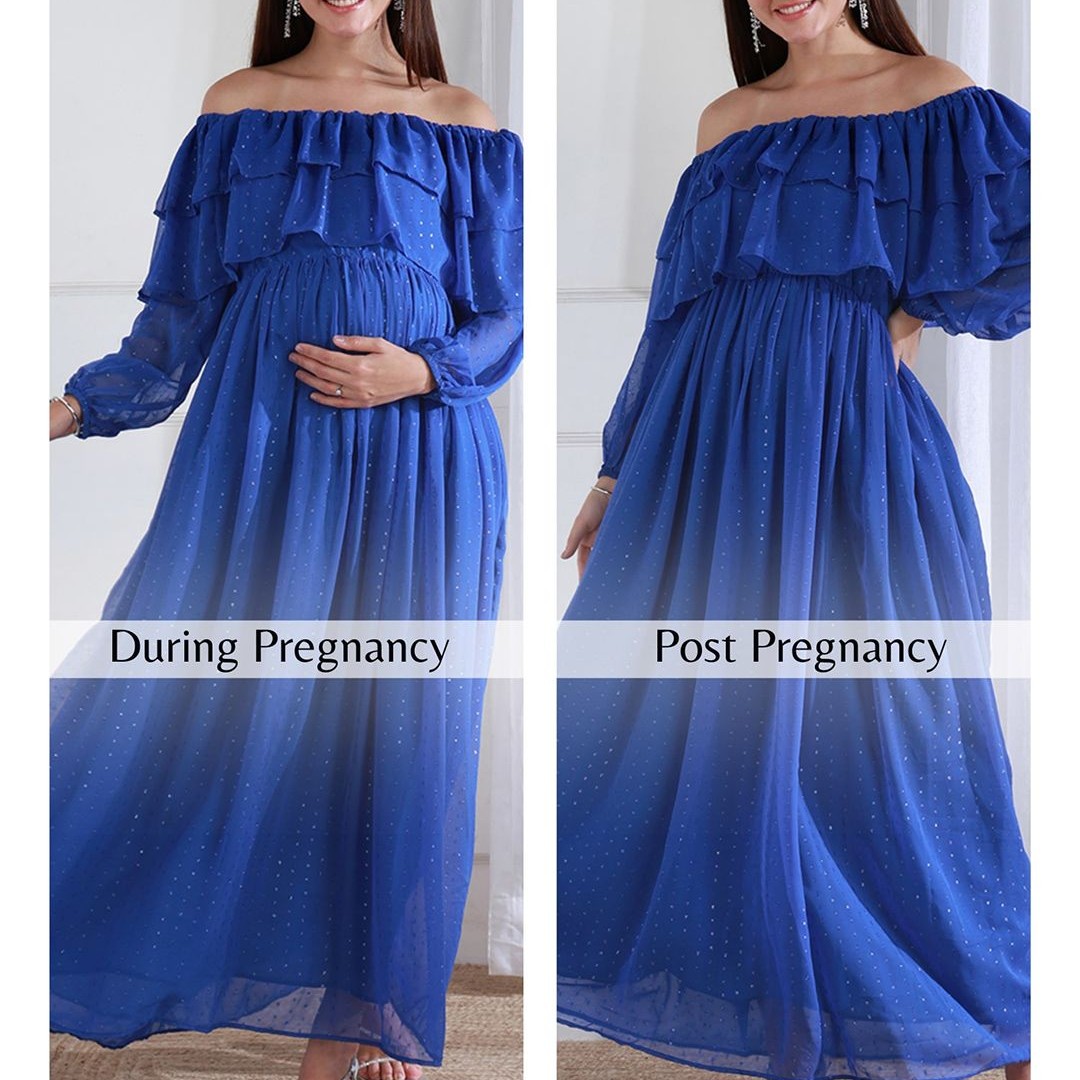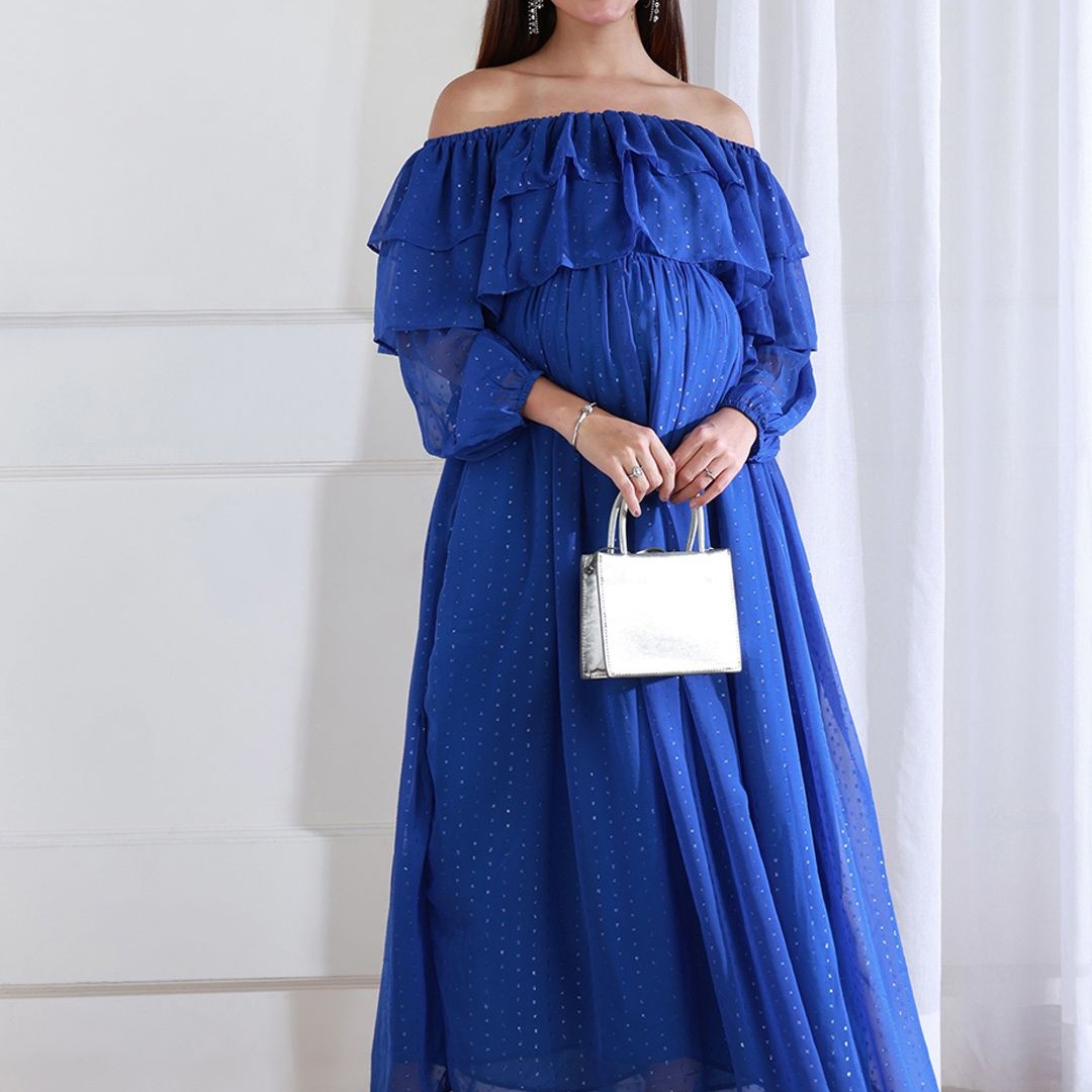 Shades of Sabi Women Off-Shoulder Puff Sleeve Ruffled Maternity Empire Dress