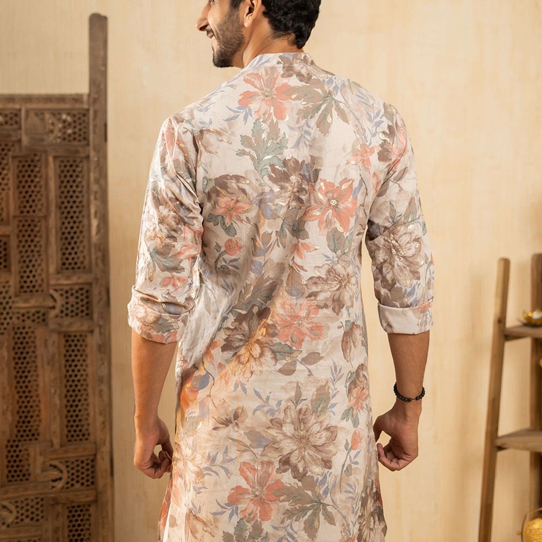 Shasak Floral Foil Printed Pastel Mandarin Collar Straight Cotton Kurta