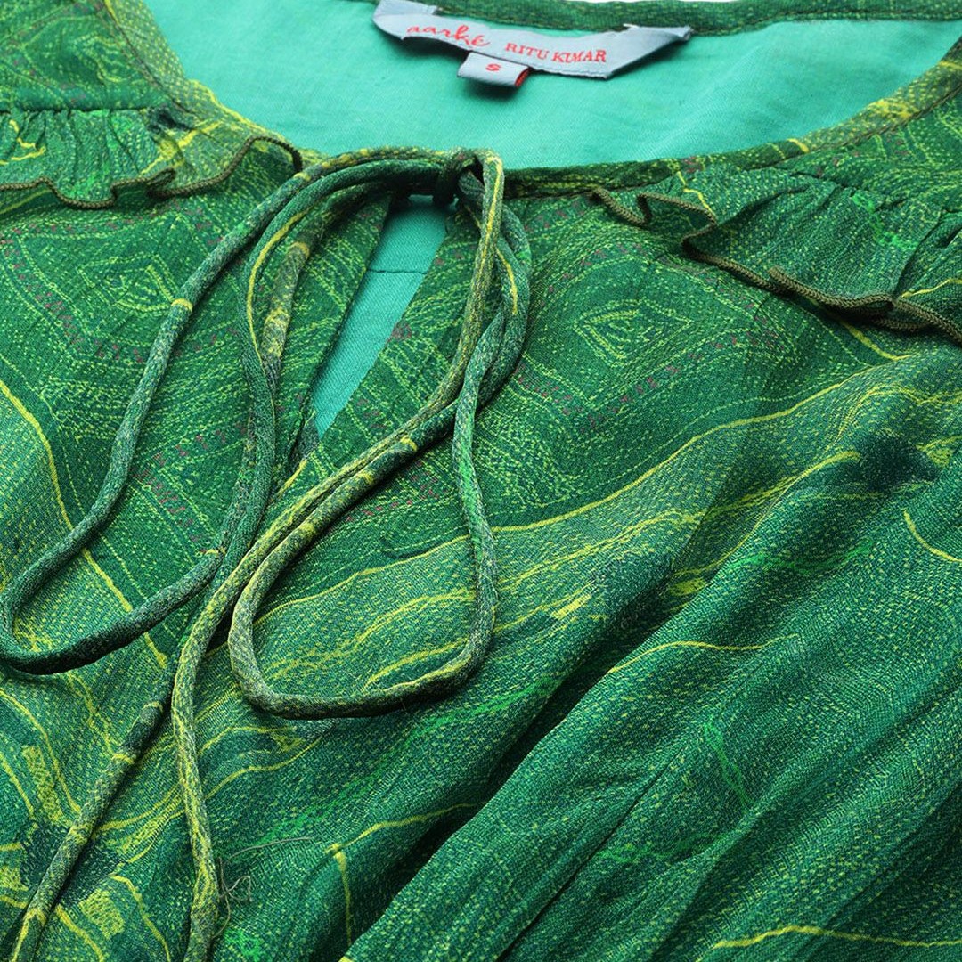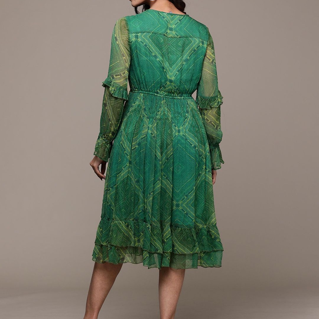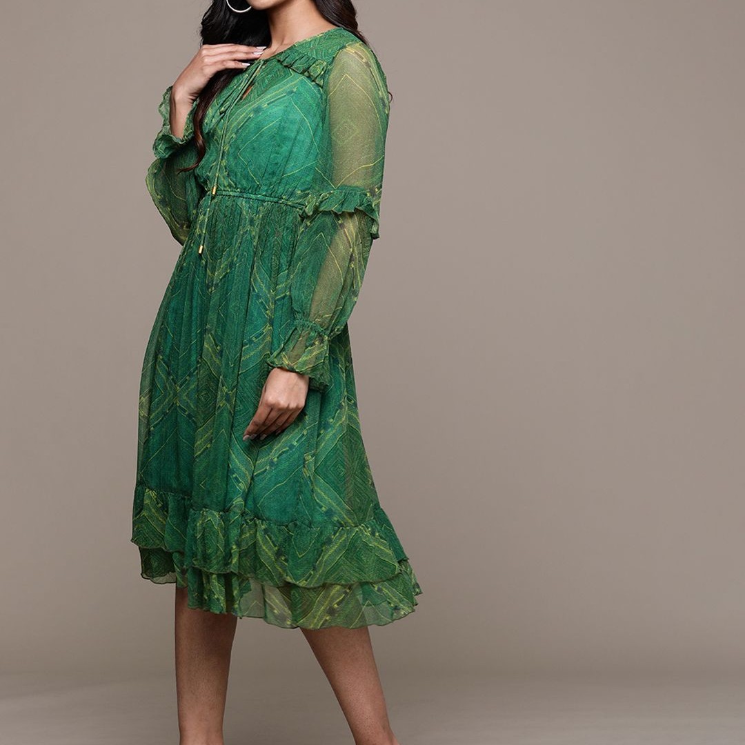 aarke Ritu Kumar Print Tie-Up Neck Puff Sleeve Ruffled Chiffon Fit & Flare Dress