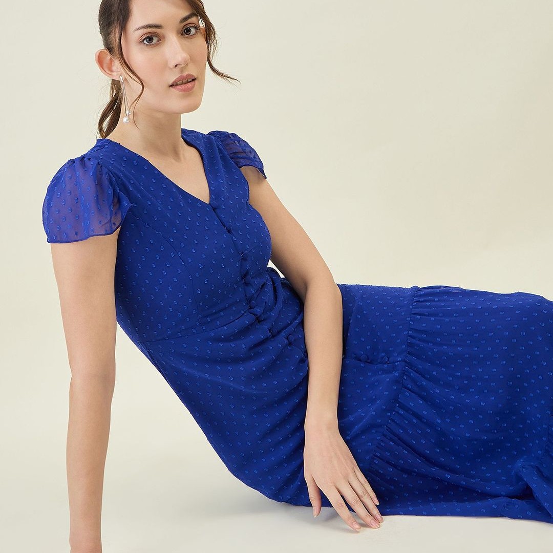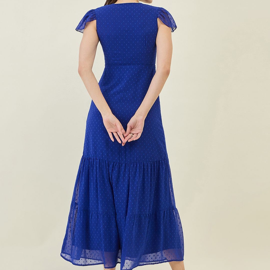 aayu Women V-Neck Tiered Self Design Flutter Sleeves A-Line Maxi Dress
