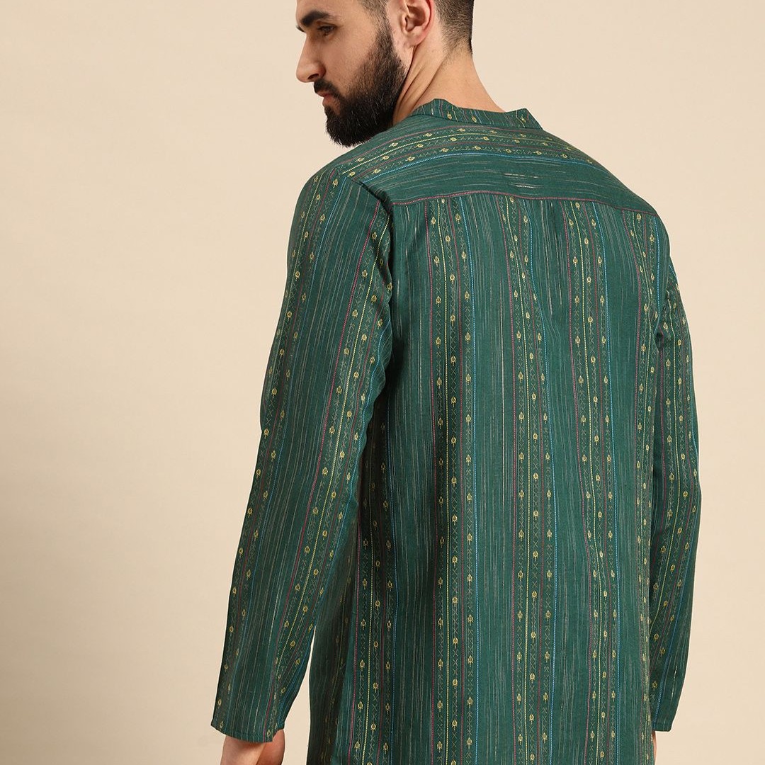 Anouk Men Green & Gold-Toned Striped Thread Work Straight Short Kurta