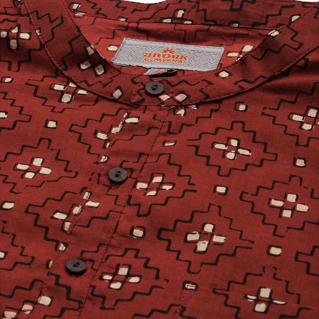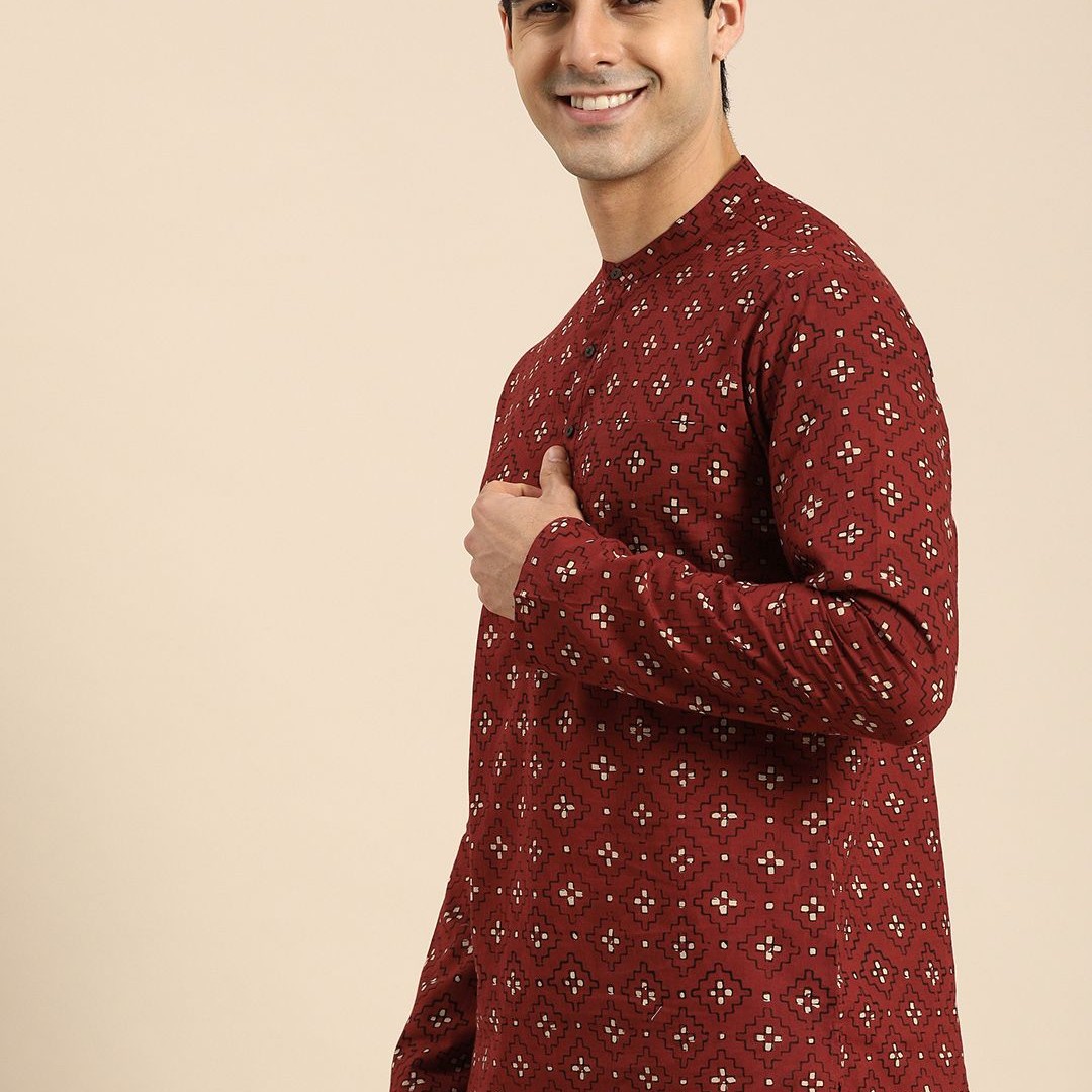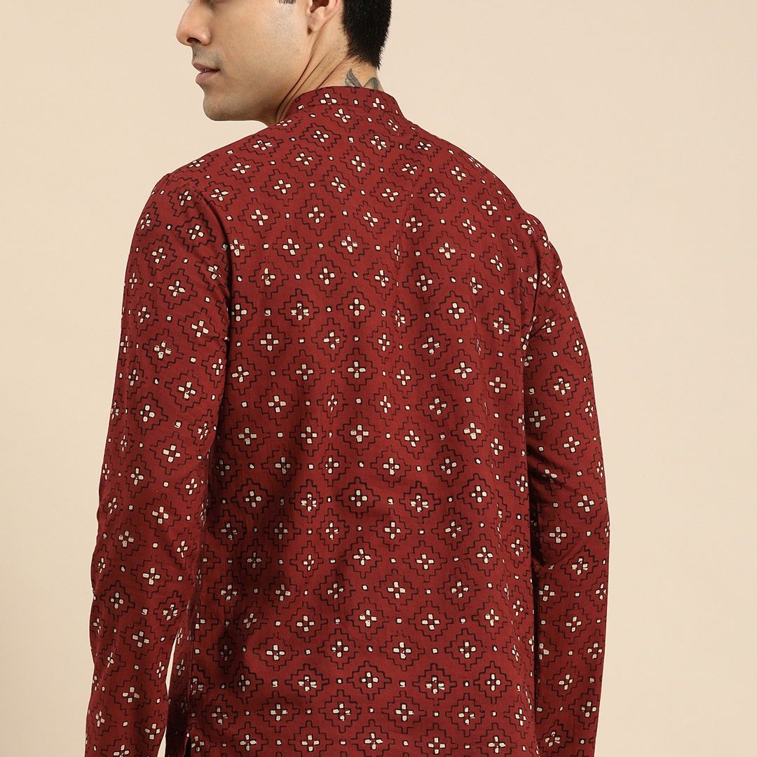 Anouk Men Red & Cream-Coloured Ethnic Motifs Printed Pure Cotton Short Kurta
