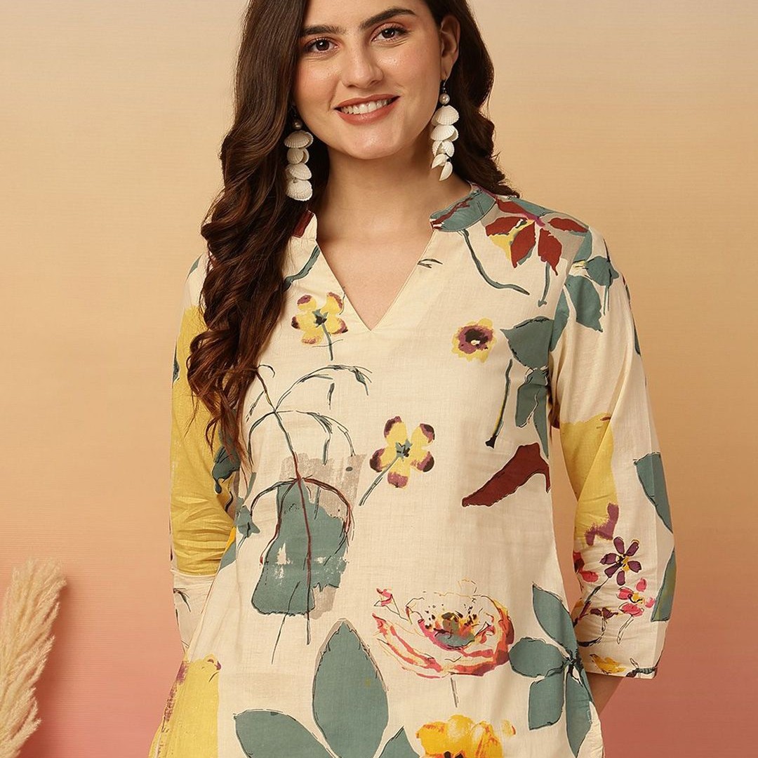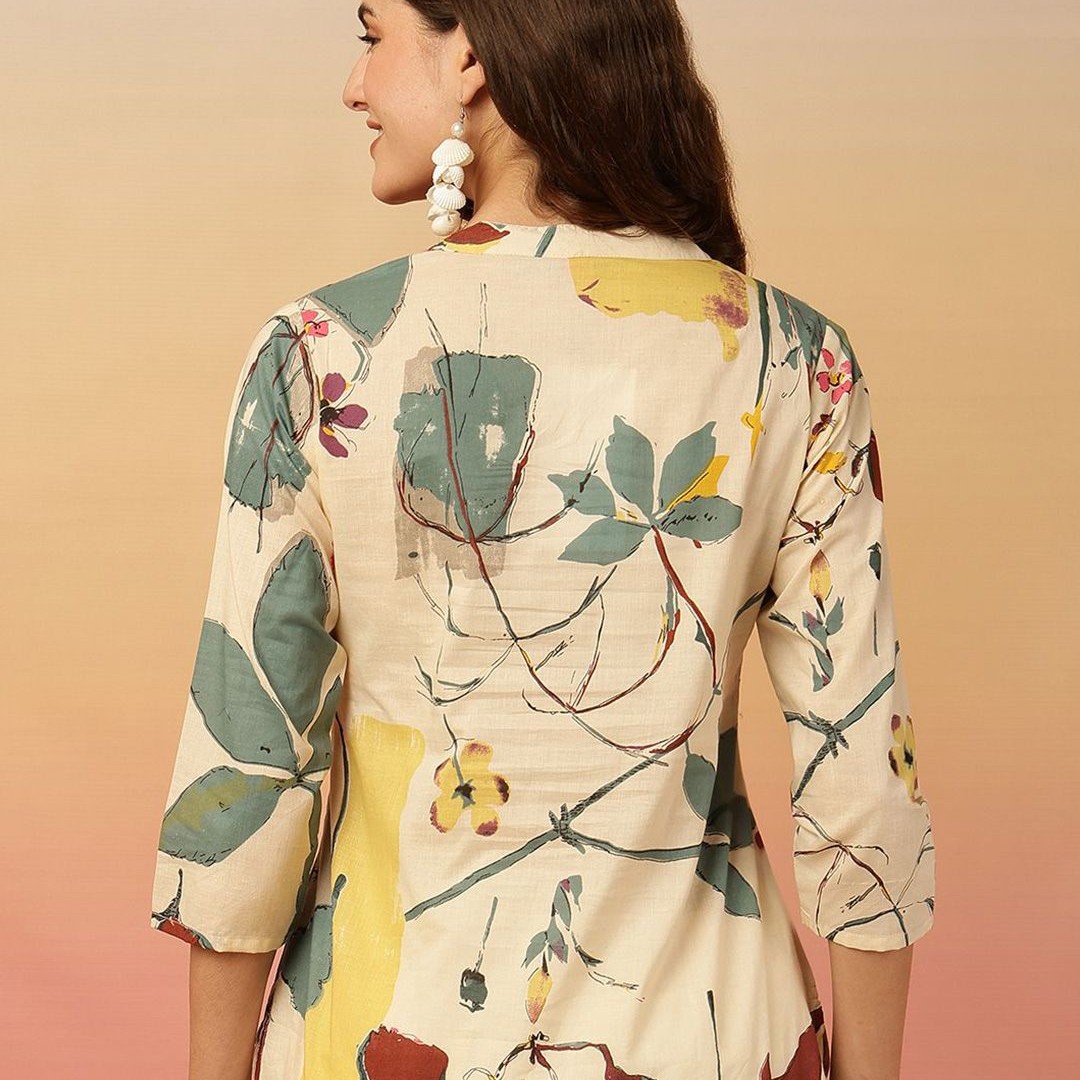Anouk Rustic Floral Print Mandarin Collar Cotton Top