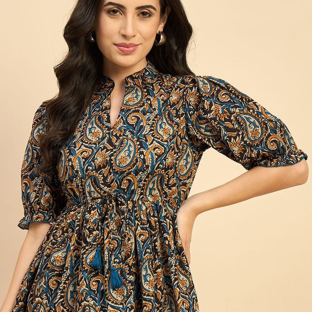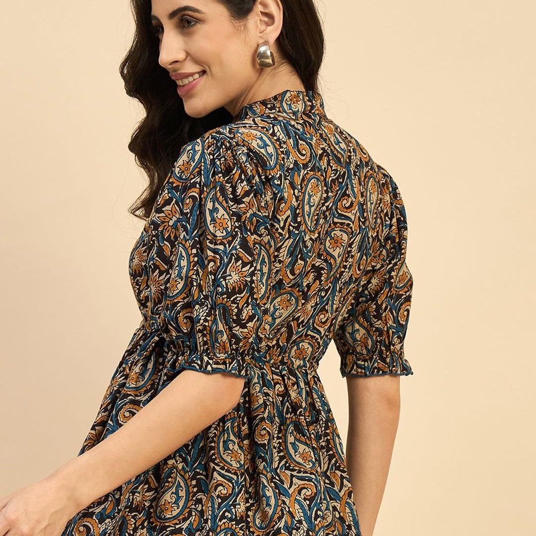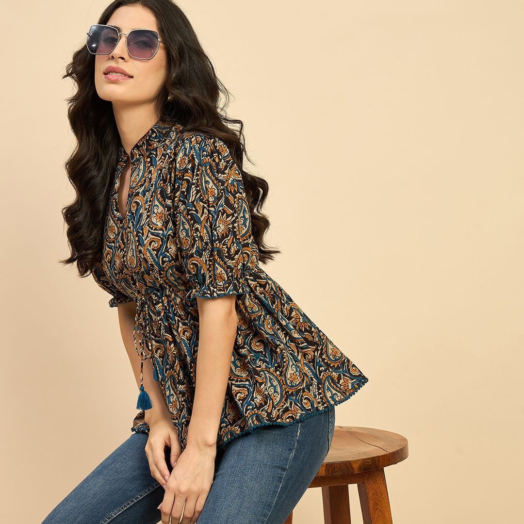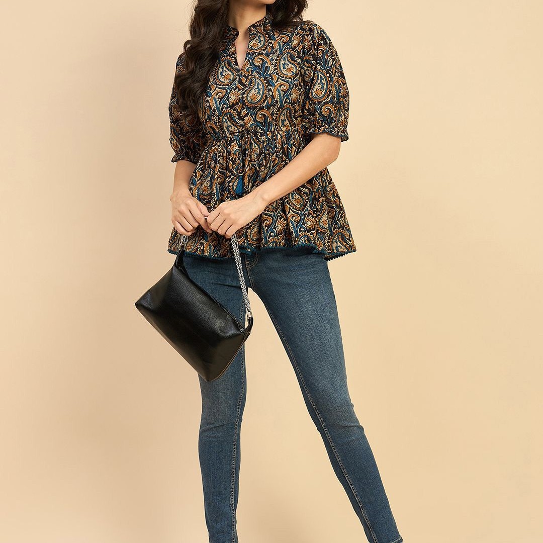 Azira Women Ethnic Printed Mandarin Collar Cotton Top