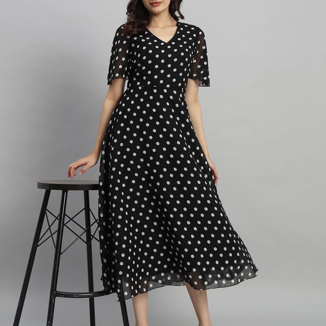 Curvydrobe Polka Dot Flared Sleeve A-Line Midi Dress