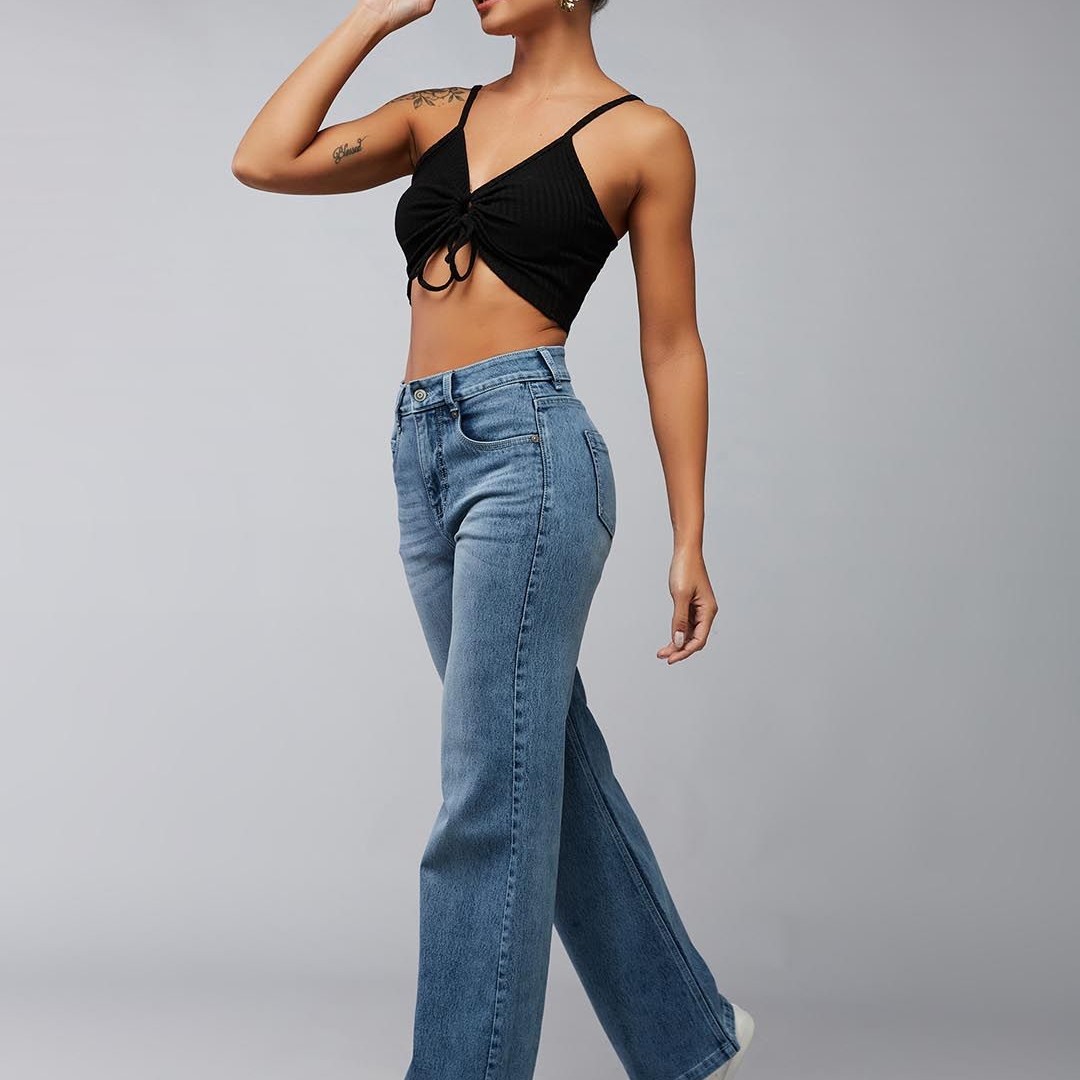 DOLCE CRUDO Women Wide Leg High-Rise Light Fade Stretchable Jeans