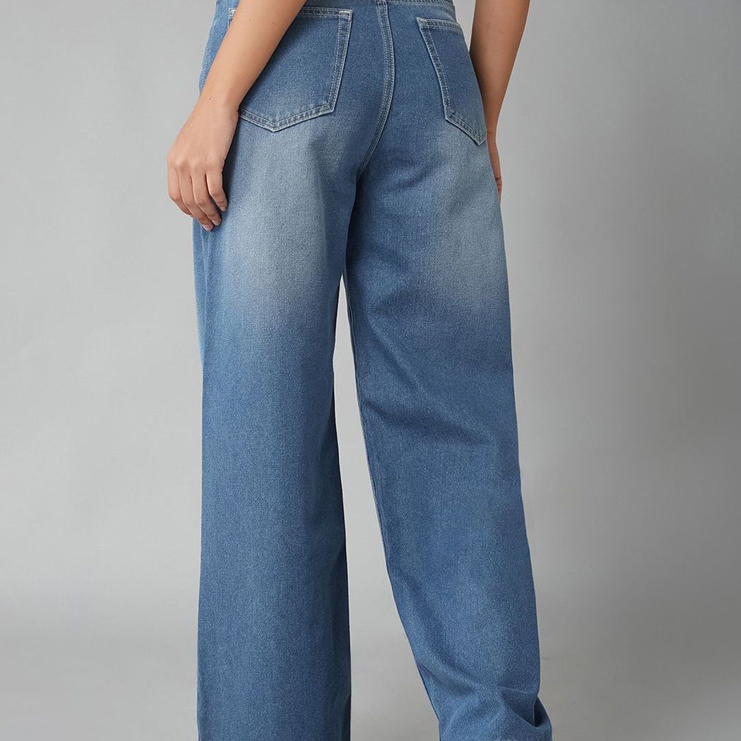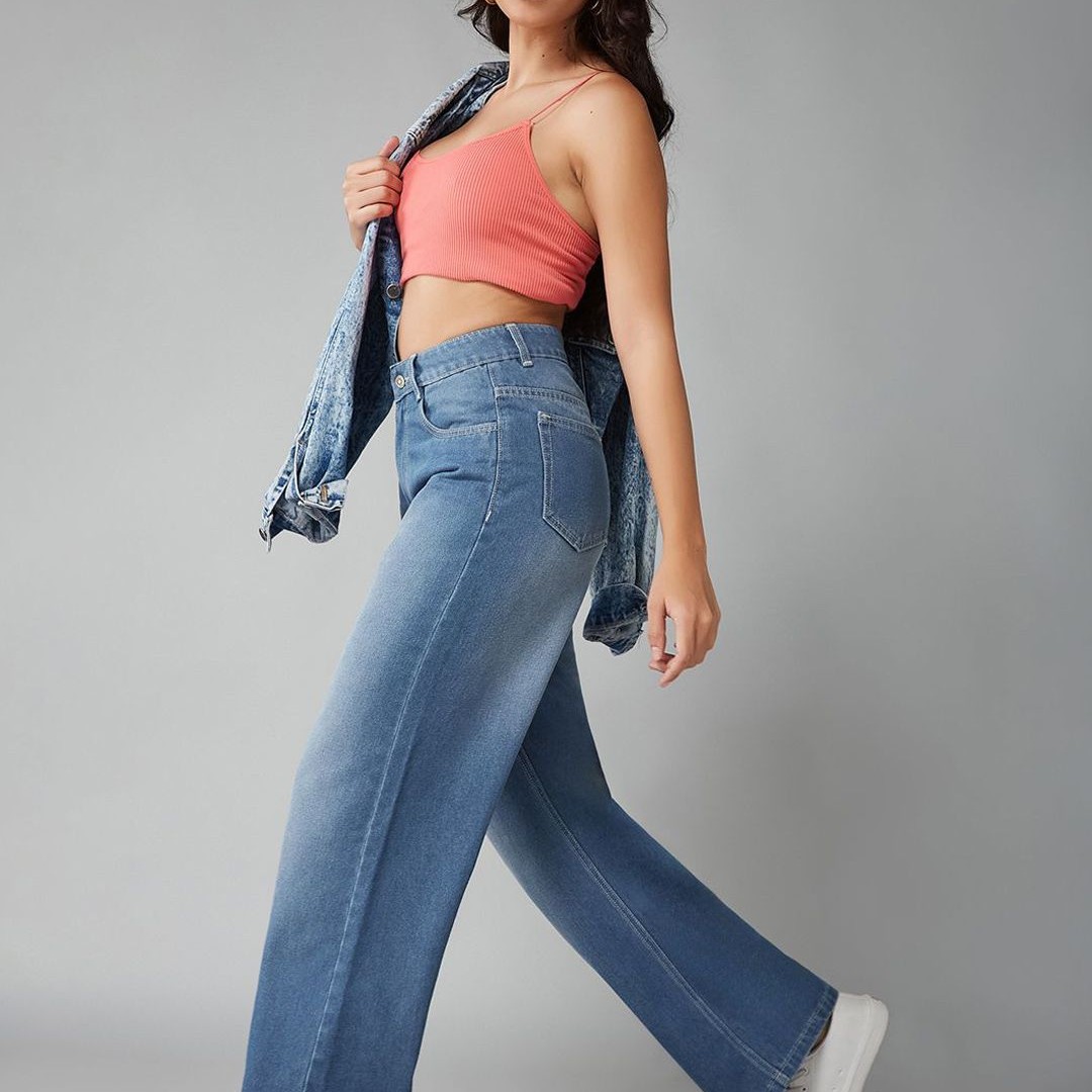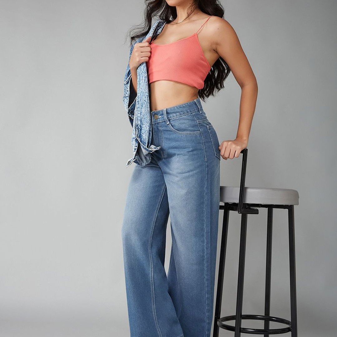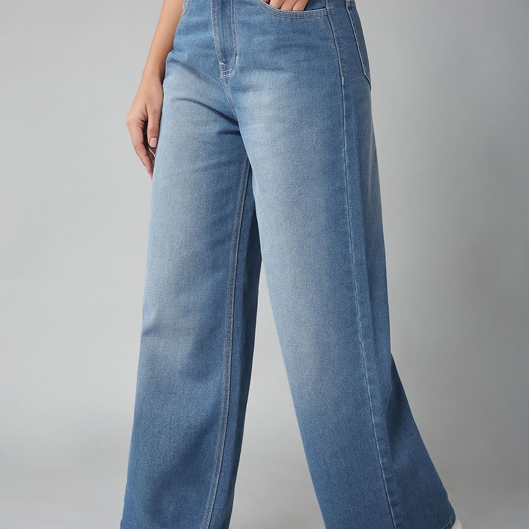 DOLCE CRUDO Women Wide Leg High-Rise Light Fade Stretchable Jeans