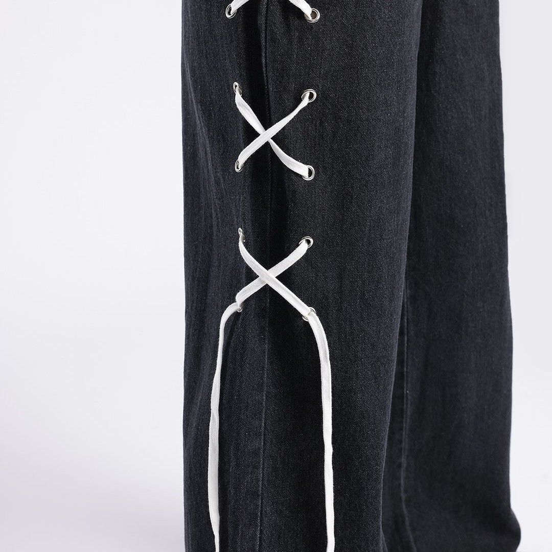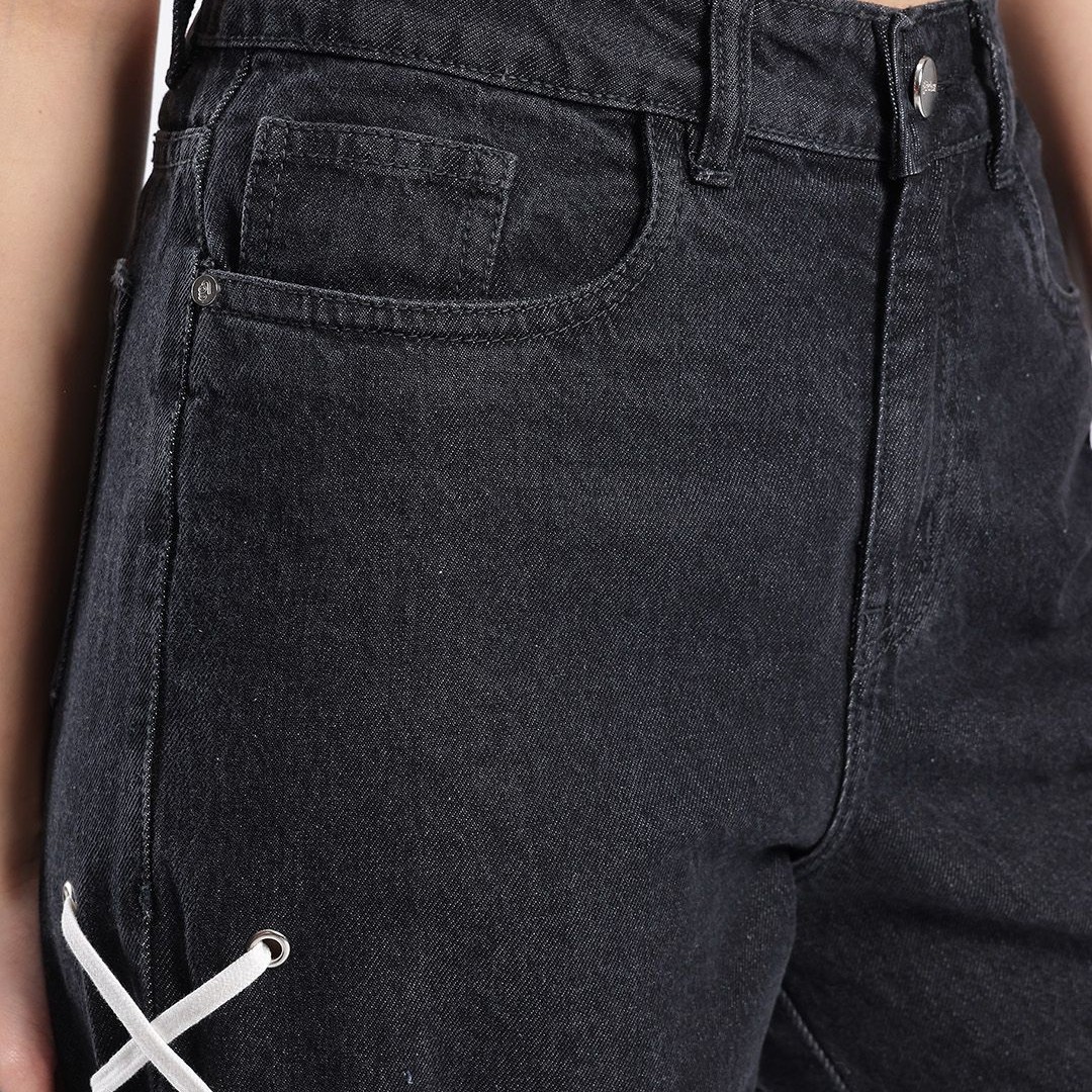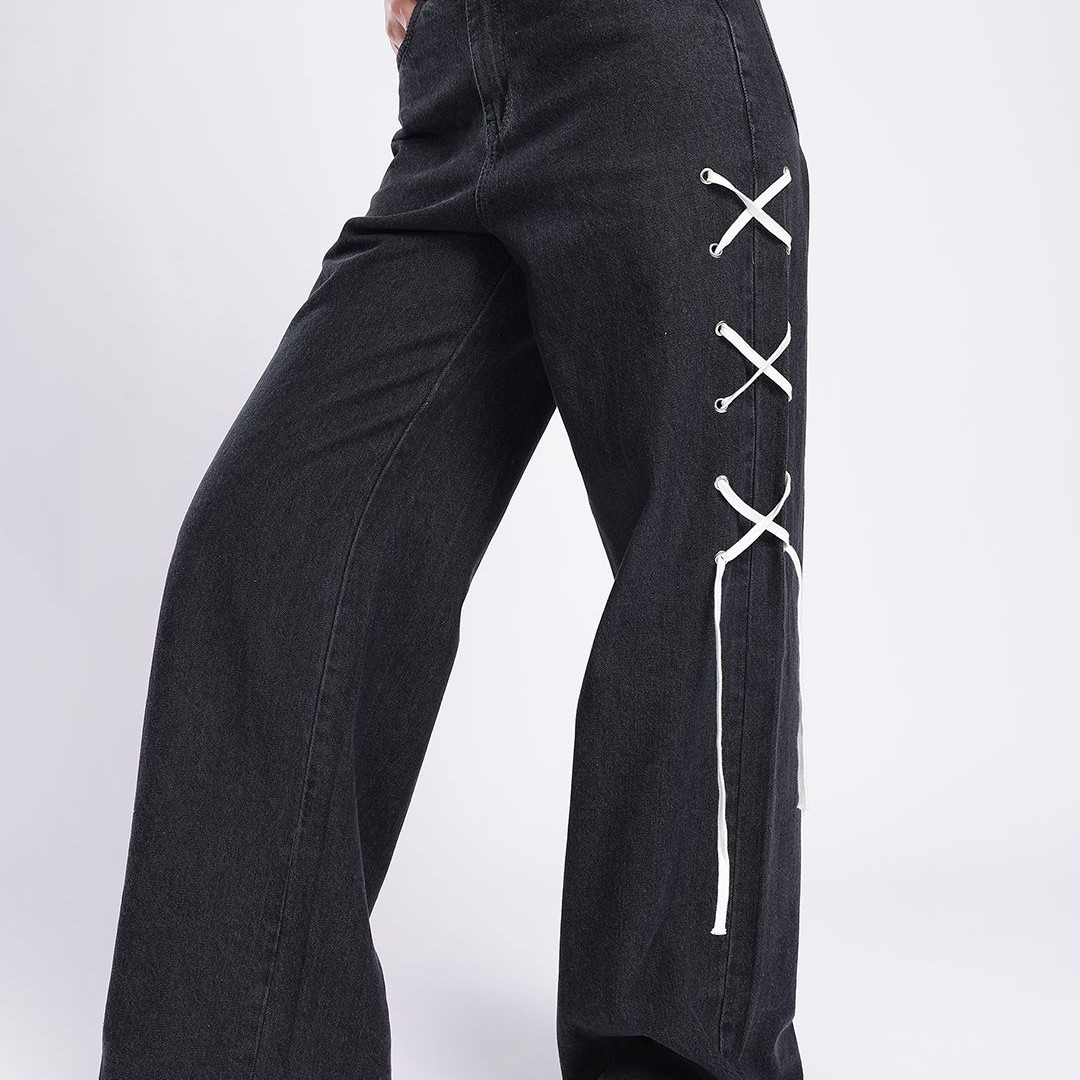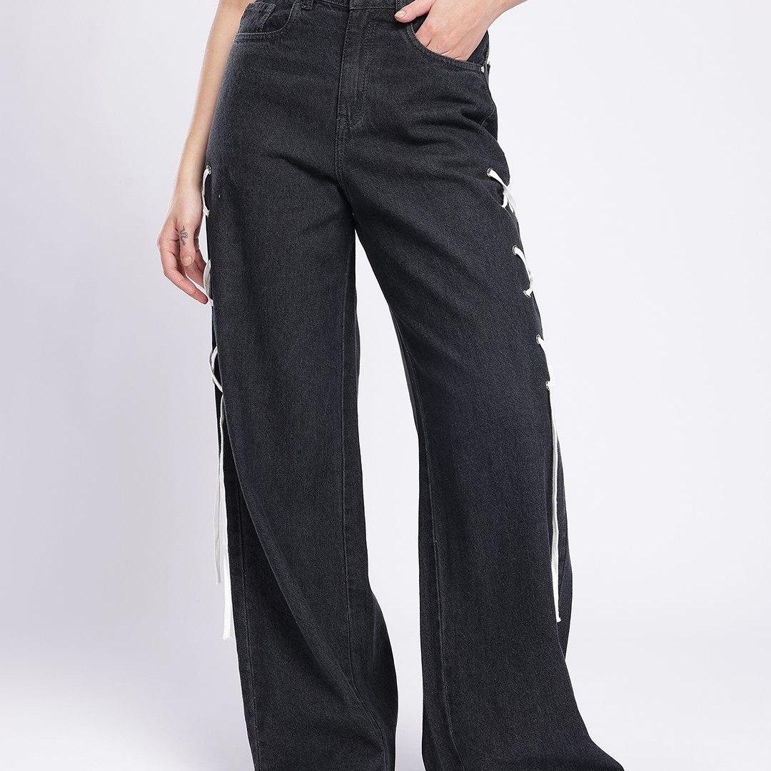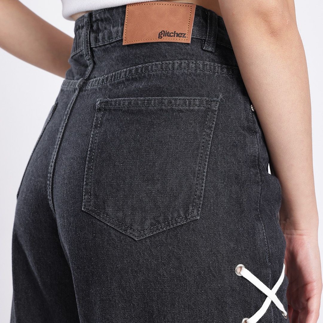 glitchez Women Baggy Wide Leg High-Rise Jeans With Fisheye Studs Tie Up
