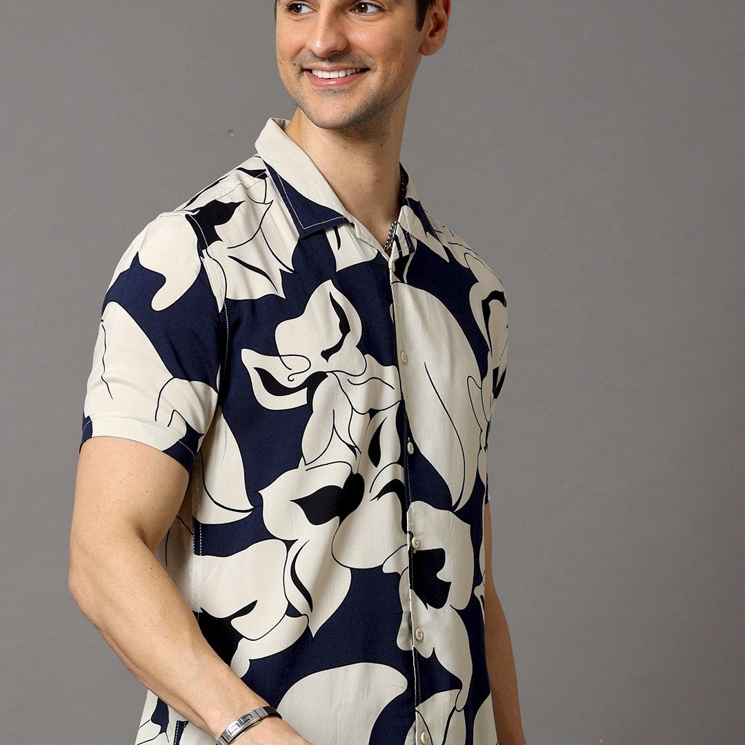 HERE&NOW Men Navy Blue & Off White Slim Fit Printed Casual Shirt