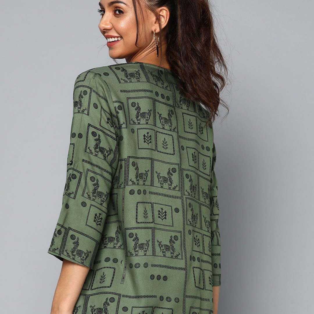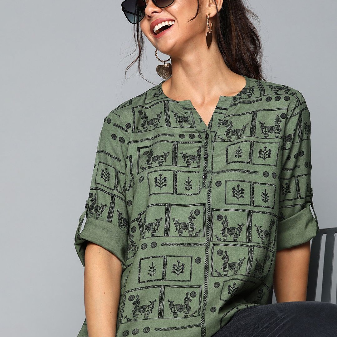 HERE&NOW Women Olive Green & Black Print Mandarin Collar Roll-Up Sleeves Top