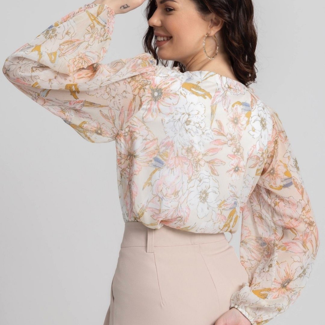 JULO Floral Print Puff Sleeve Chiffon Blouson Top