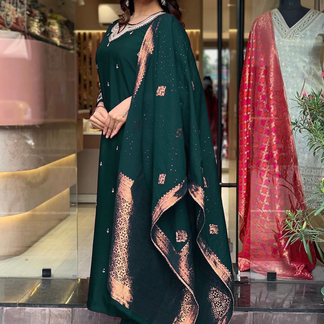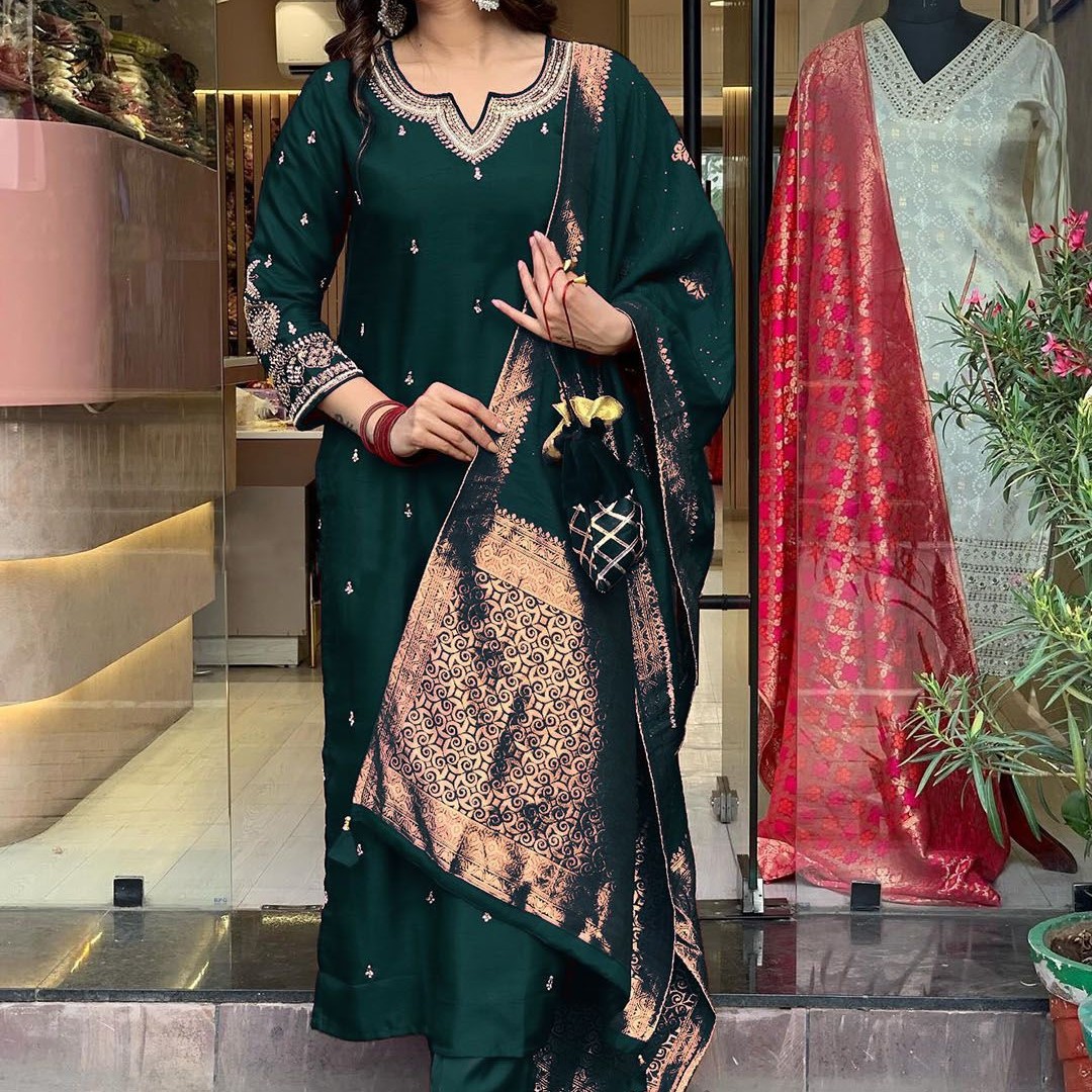 KALINI Floral Embroidered Beads and Stones Notch Neck Kurta With Trousers And Dupatta