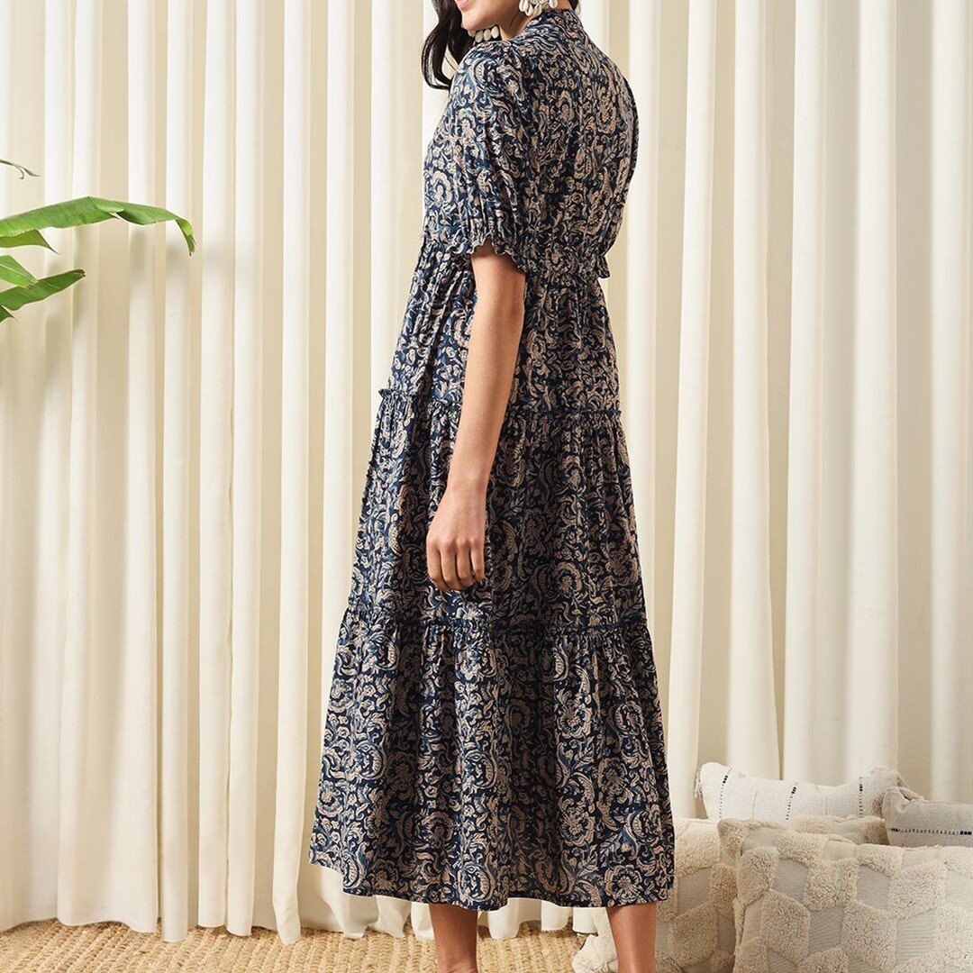 KALINI Floral Printed Mandarin Collar Puff Sleeves Cotton Fit and Flare Dress