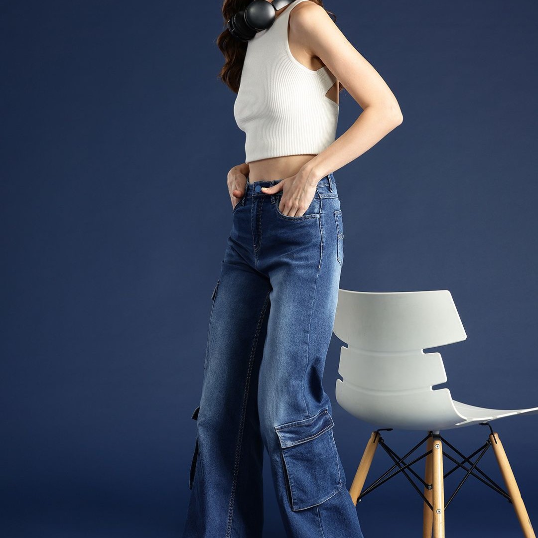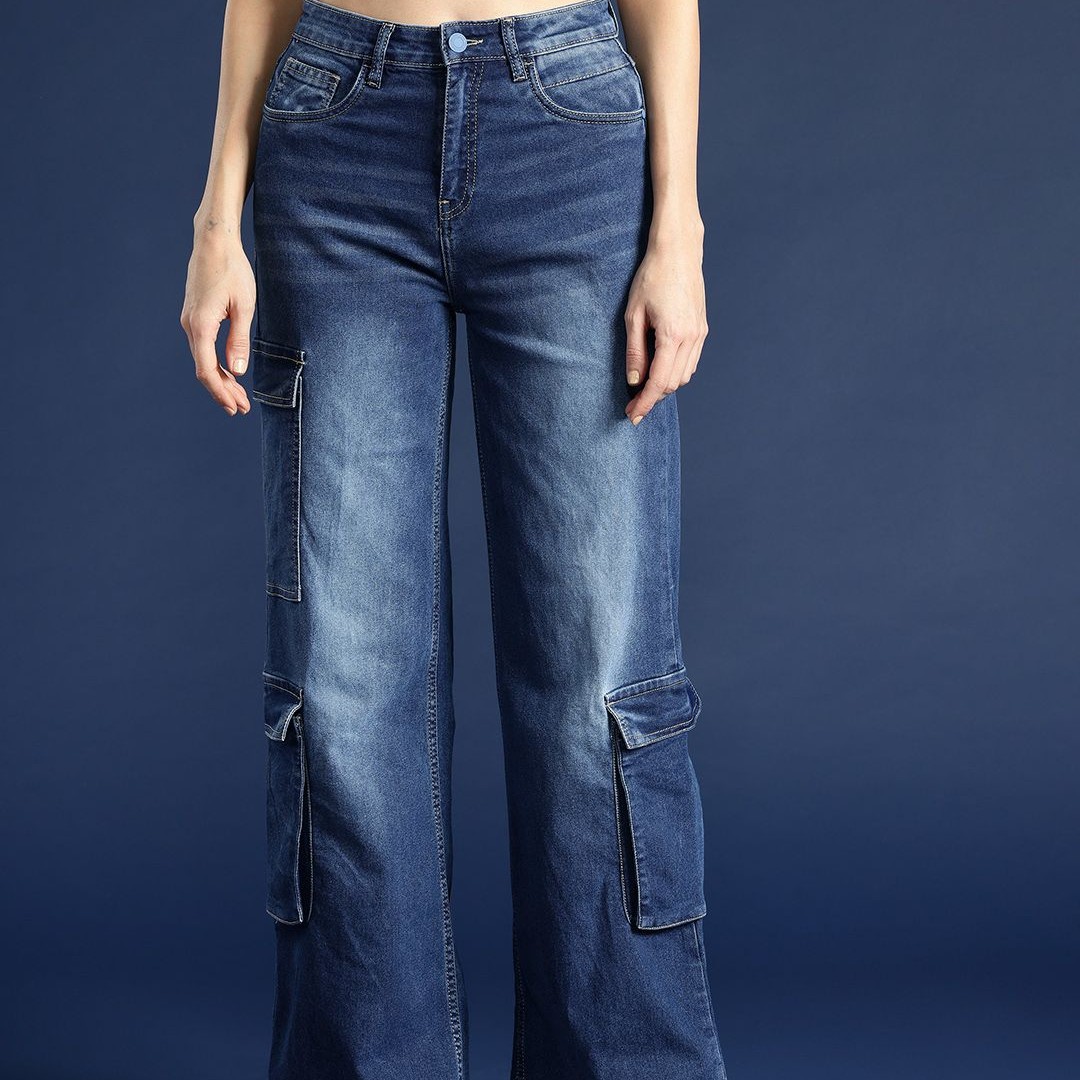 Mast & Harbour Women Wide Leg High-Rise Light Fade Stretchable Cargo Jeans
