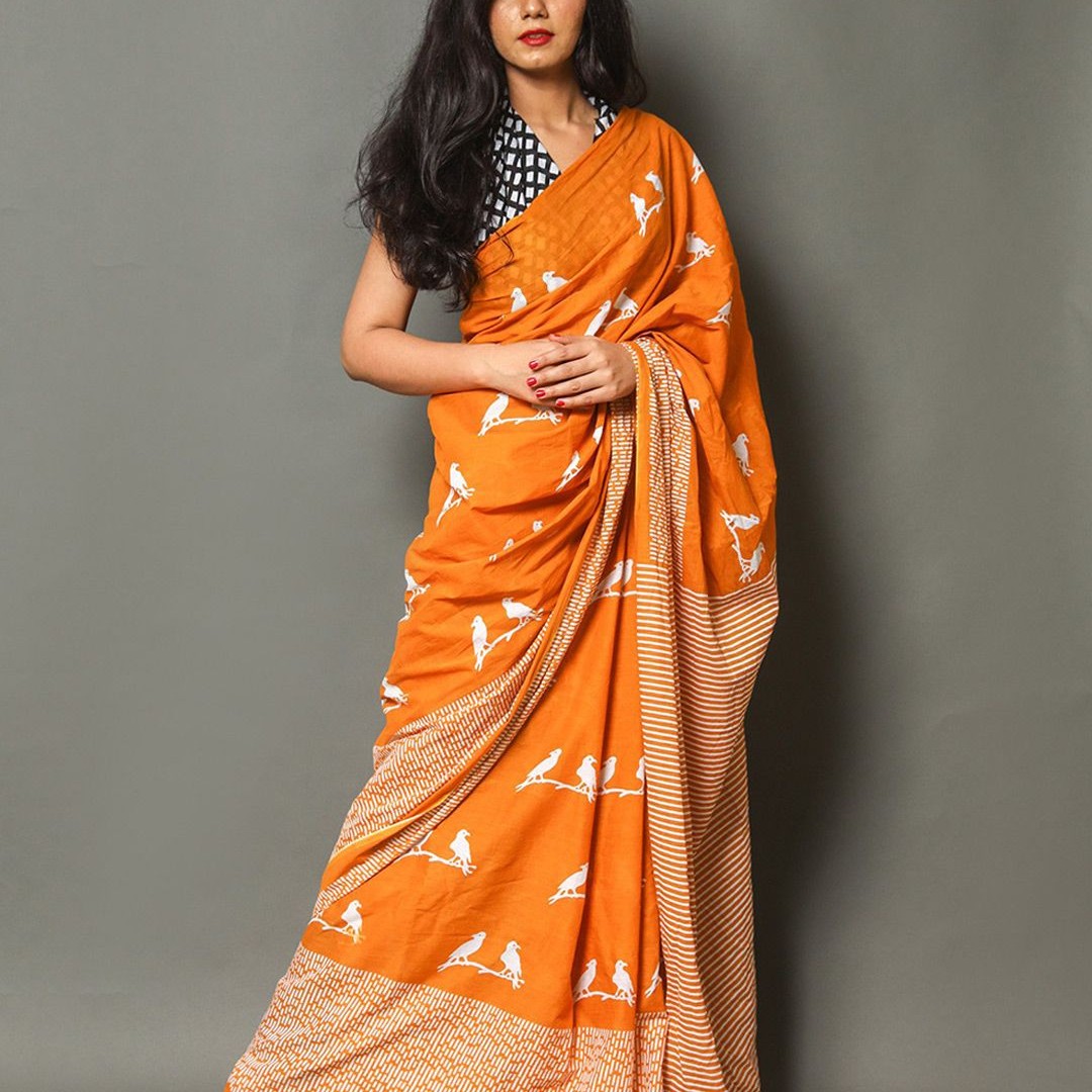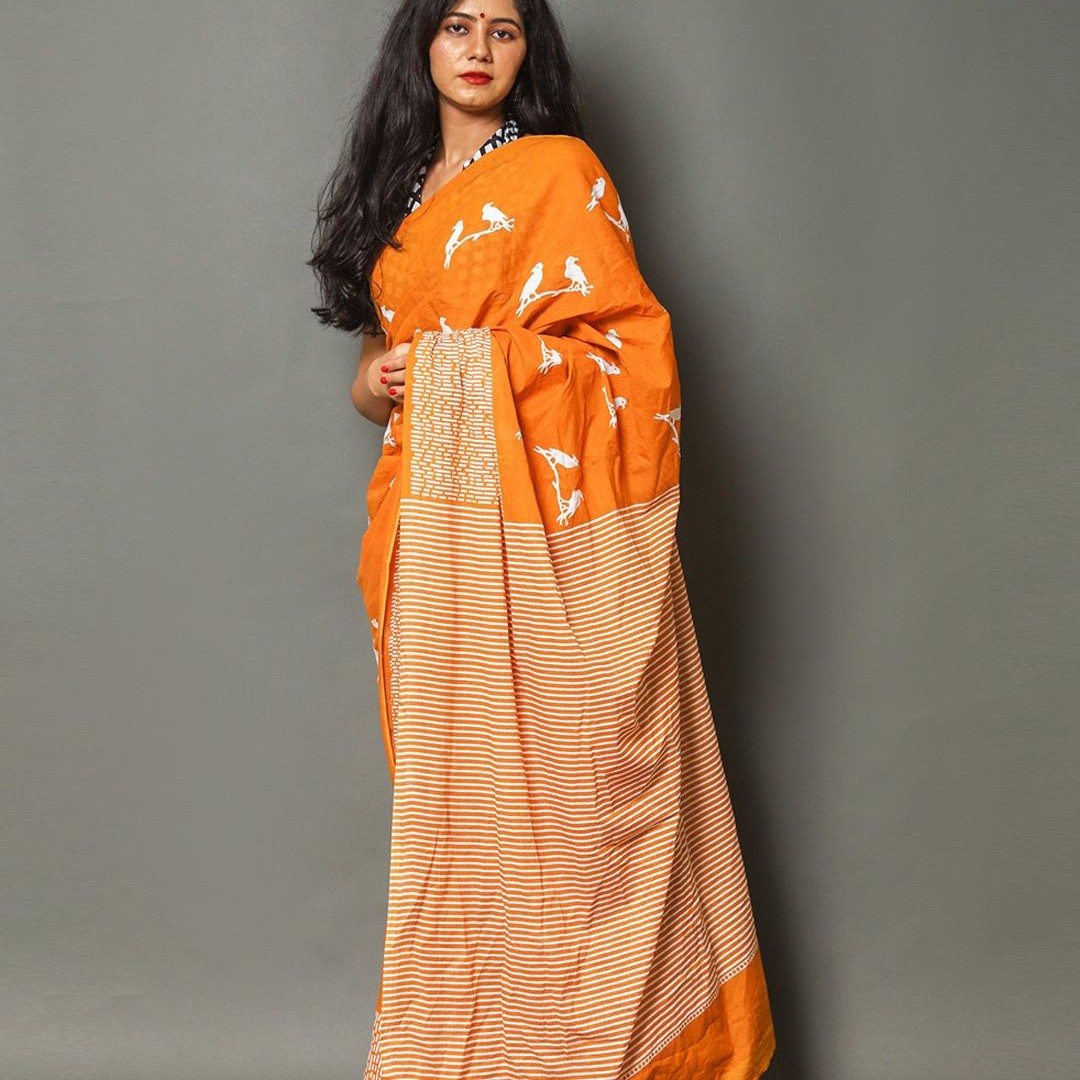 Pinkcity Trade World Geometric Printed Pure Cotton Mulmul Bagru Saree