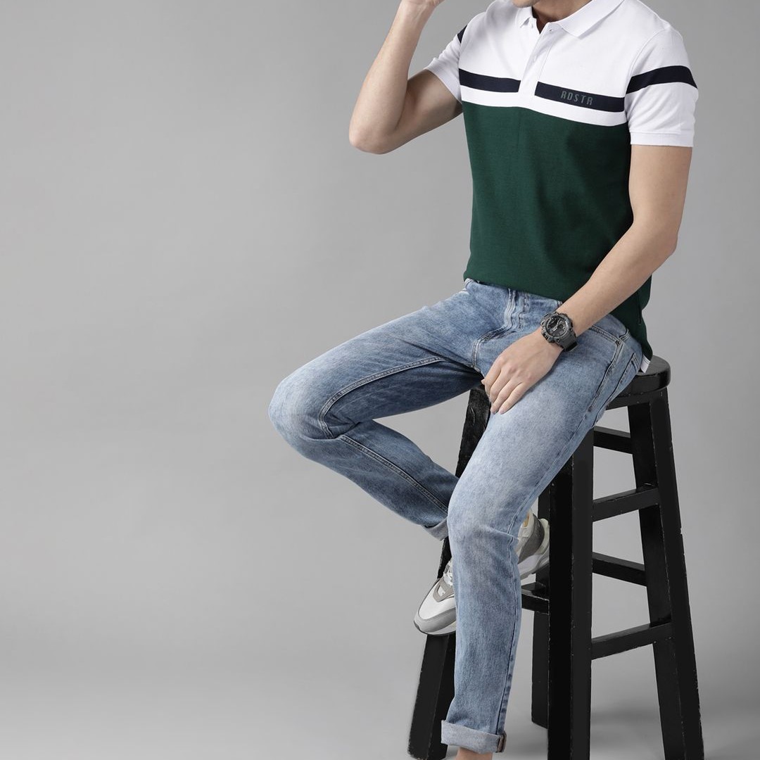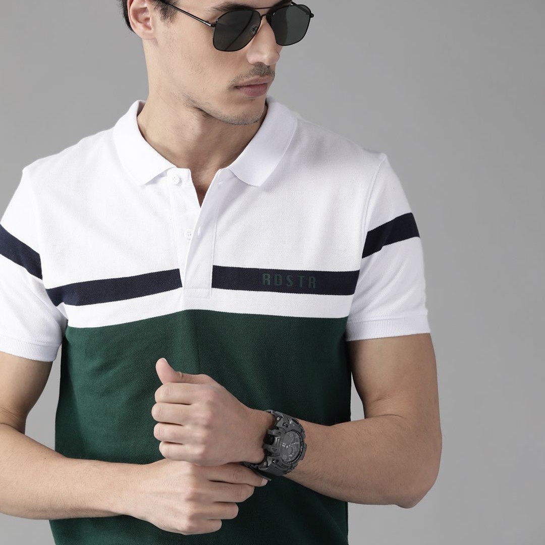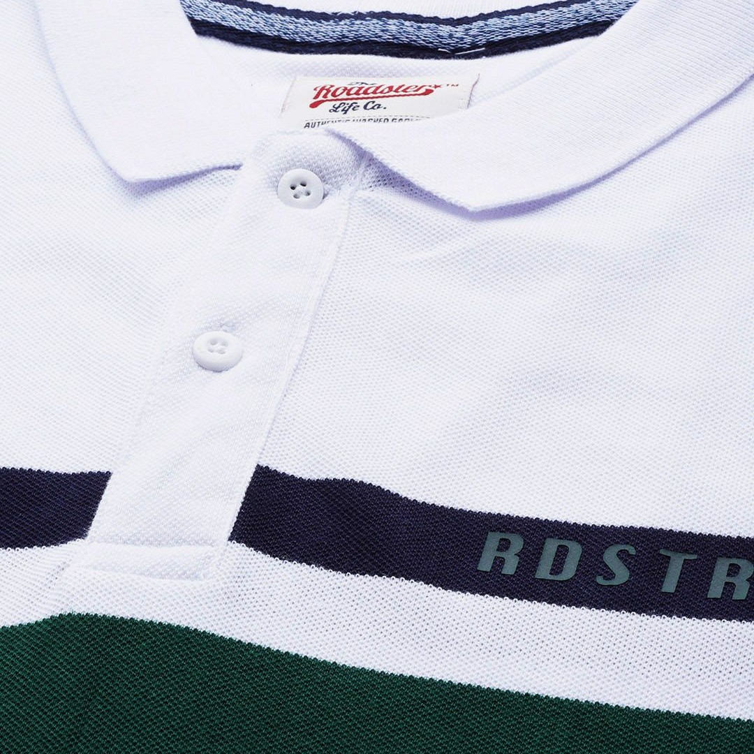 Roadster Men Green & White Pure Cotton Colourblocked Polo Collar T-shirt