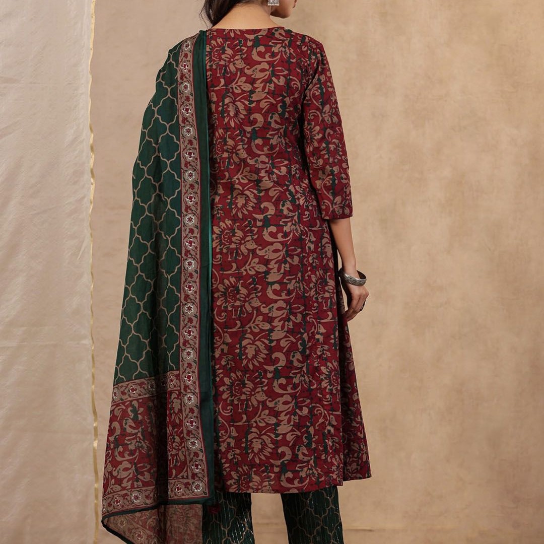 Sangria Floral Printed Pure Cotton Straight Kurta With Trouser & Dupatta