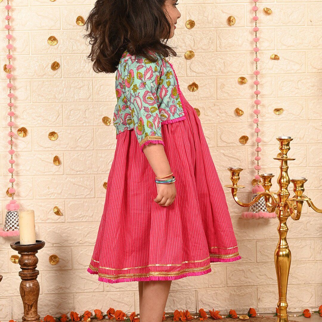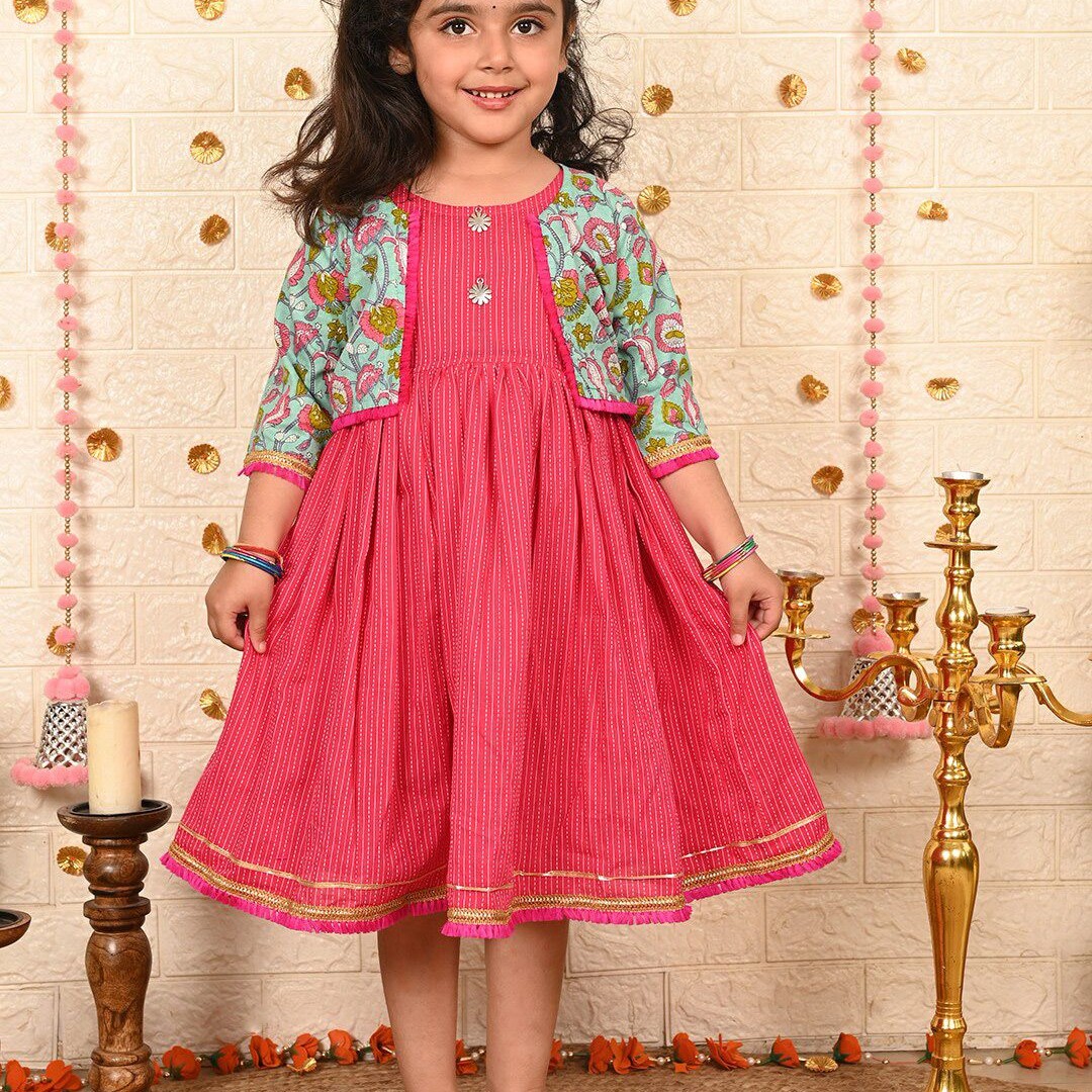Sangria Girls Striped Cotton A-Line Ethnic Dress With Jacket