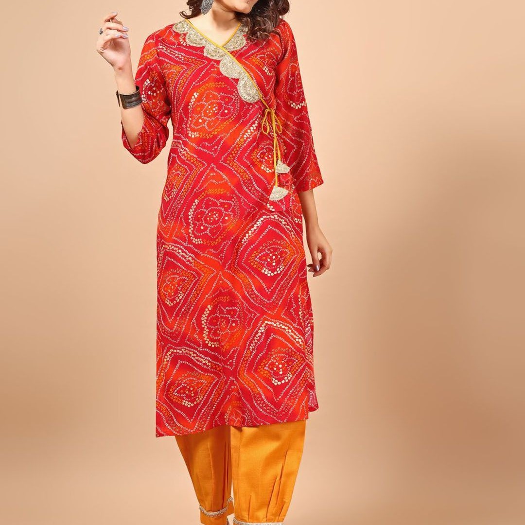 Sangria Red Bandhani Printed Angrakha Sequined Straight Kurta