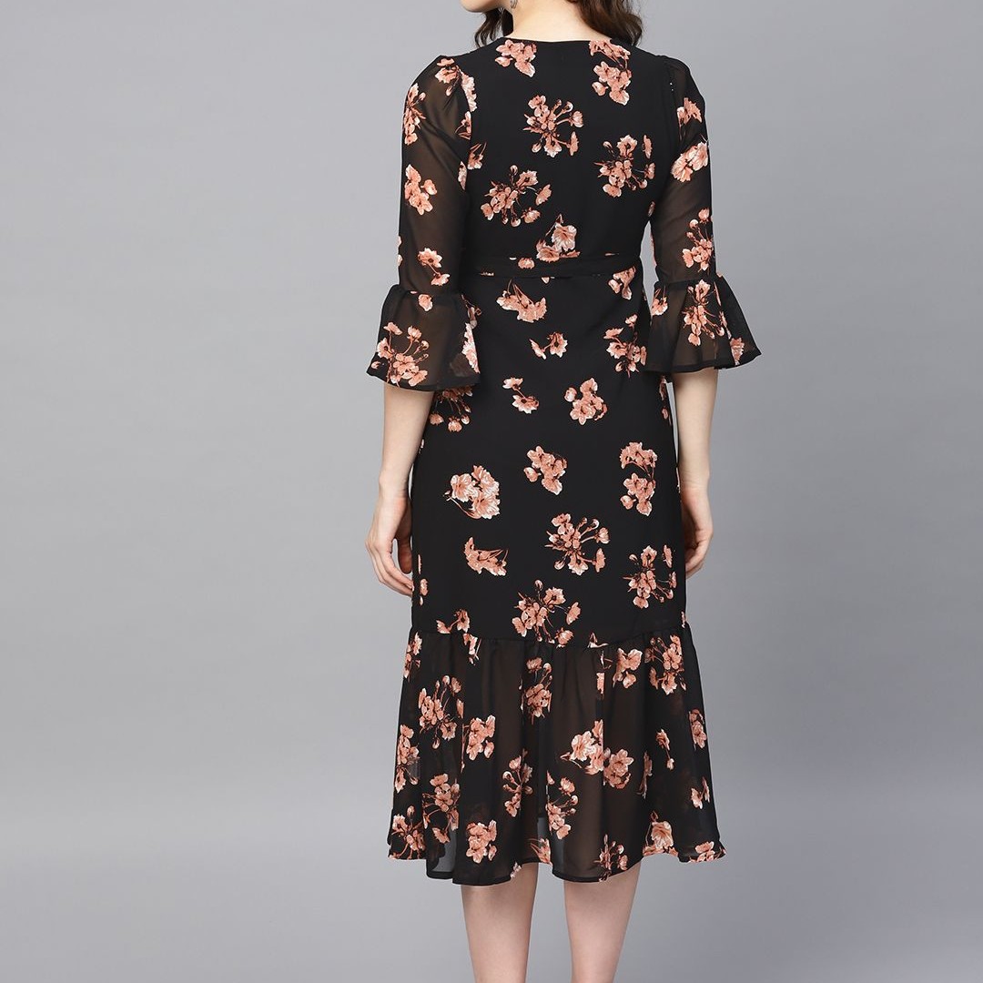SASSAFRAS Black & Pink Floral Printed Wrap Dress