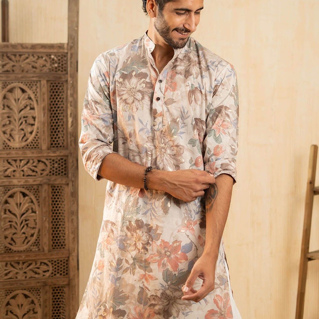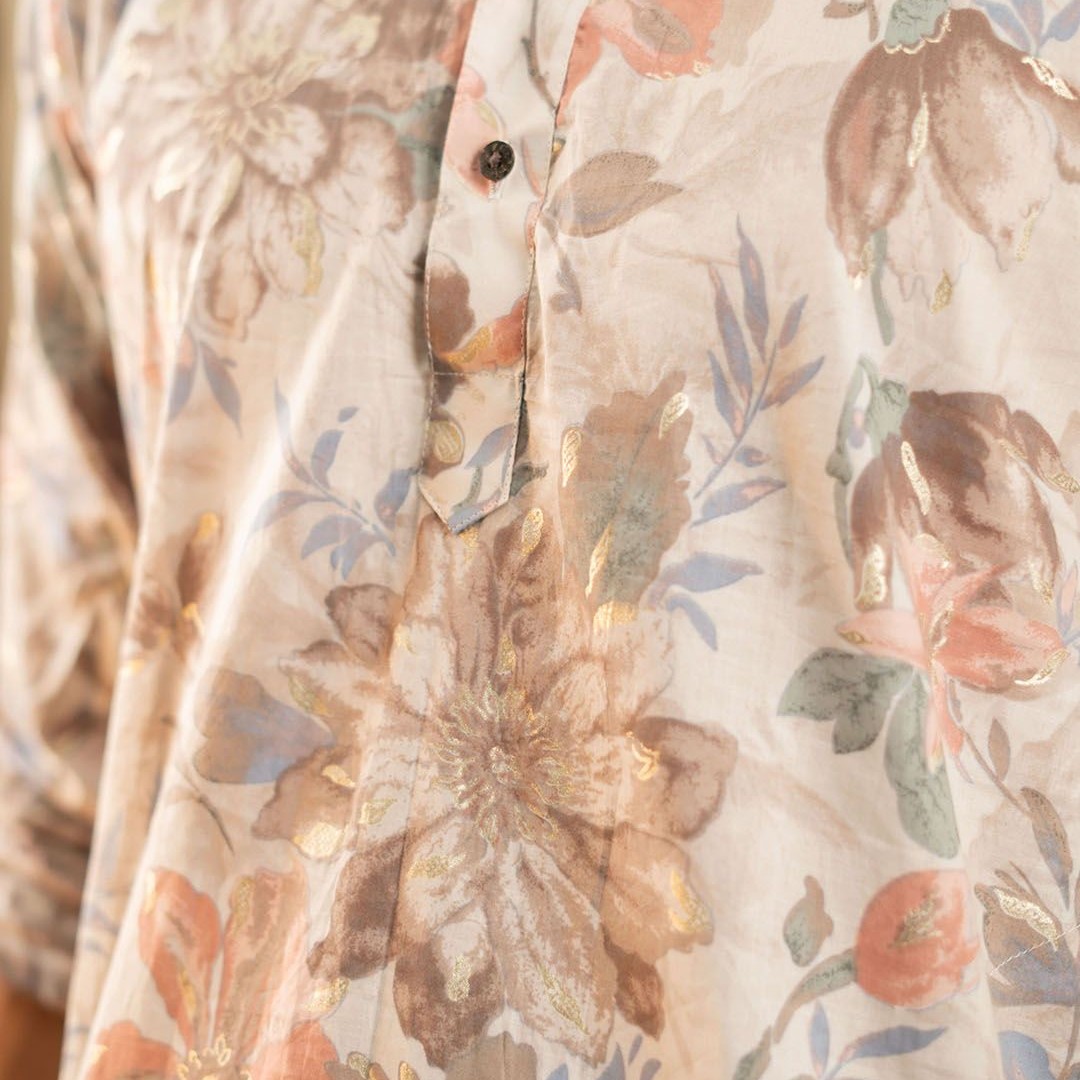 Shasak Floral Foil Printed Pastel Mandarin Collar Straight Cotton Kurta