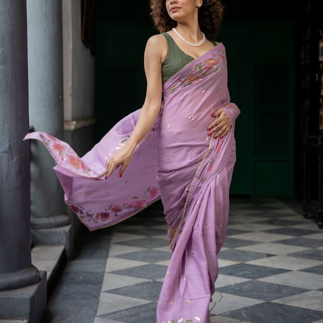 Suta Floral Printed Lavender Color Cotton Blend Saree