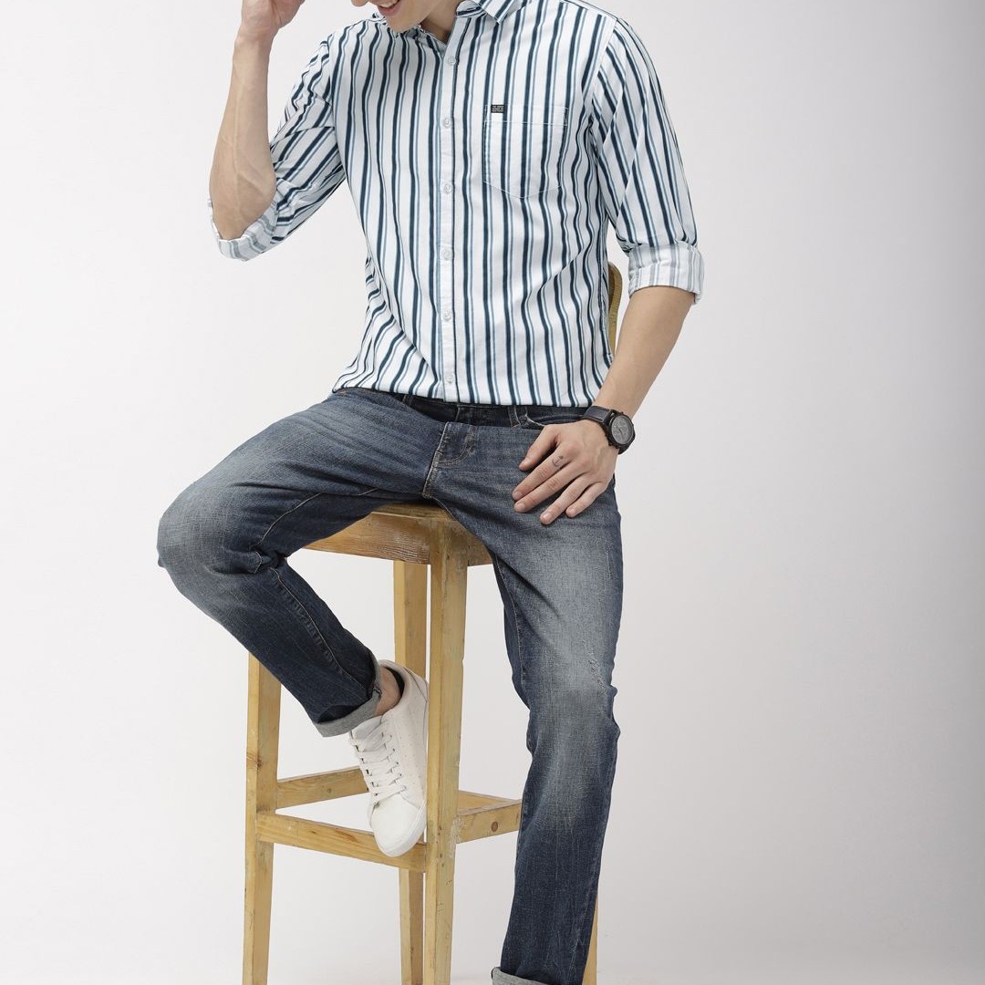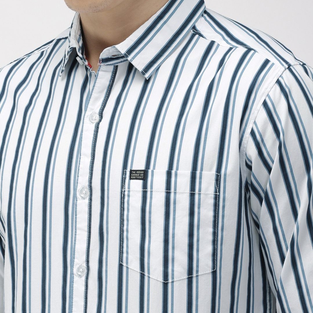 The Indian Garage Co Men White & Teal Blue Slim Fit Striped Casual Shirt